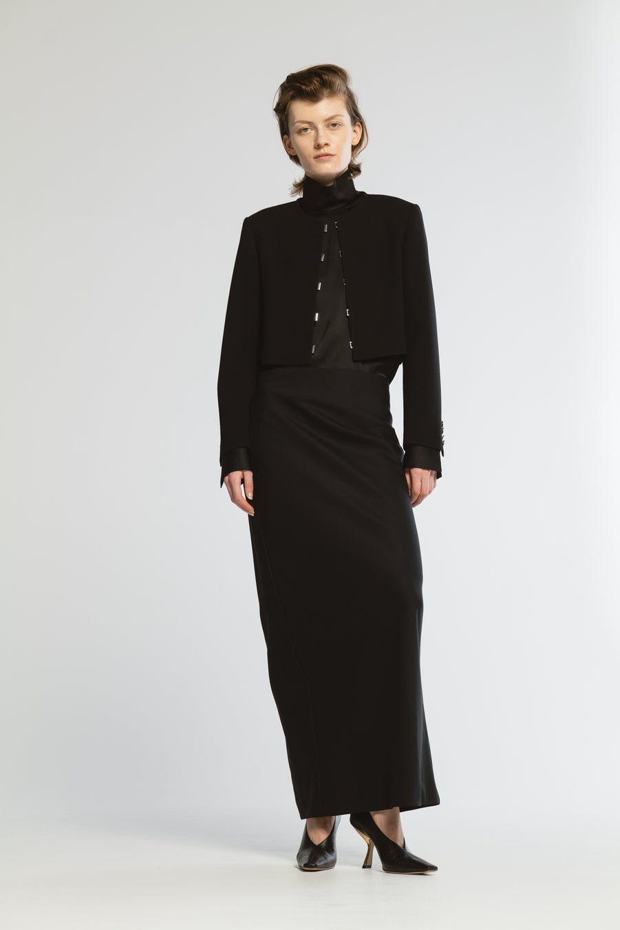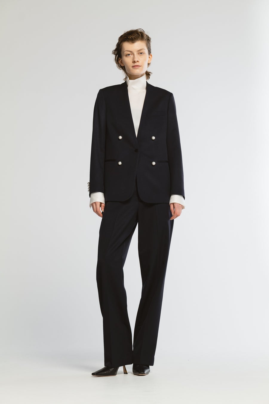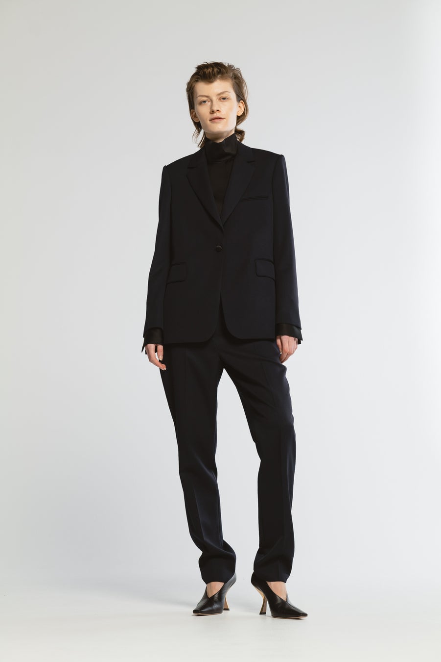 サテンのくるみボタンが映えるシングルブレストジャケット。計算されたシルエットで美しいマニッシュな印象を実現。