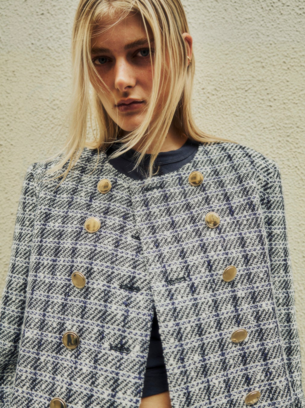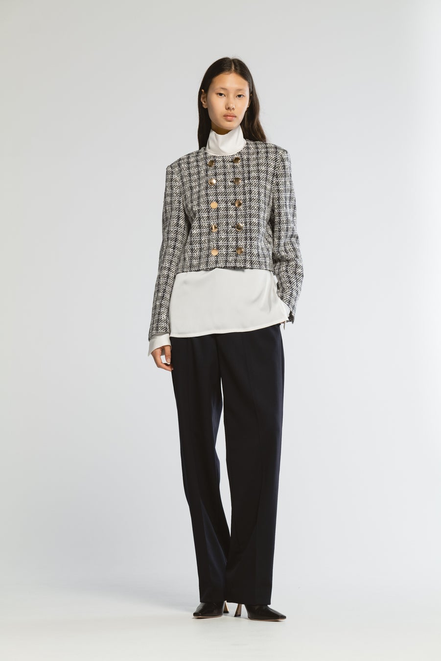 装飾性の高いボタンを配したノーカラージャケット。袖口にも同様のボタンを配置し、後ろ姿にも洗練されたエレガンスを演出します。