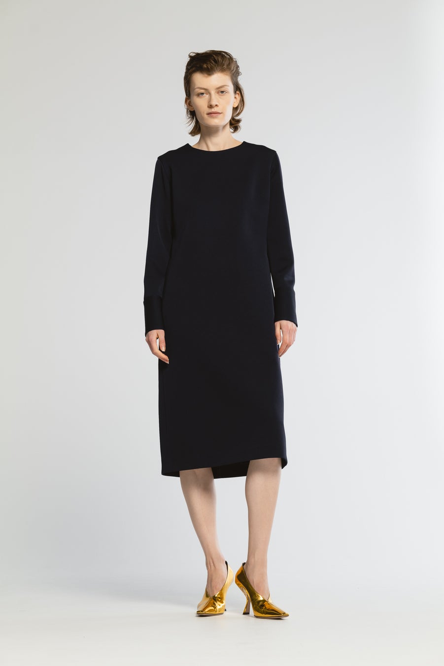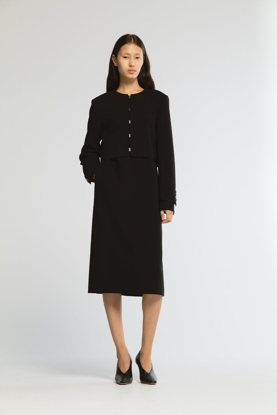 カフス裏にサテン生地を採用した膝丈ドレス。ショートジャケットとのセットアップで、フォーマルからカジュアルまで活躍。