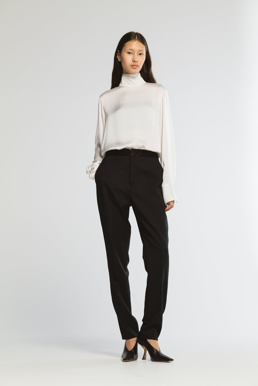 サテン切り替えが際立つテーパードパンツ。ヴィンテージギャバジン素材の美しい落ち感で、エレガントな装いに。