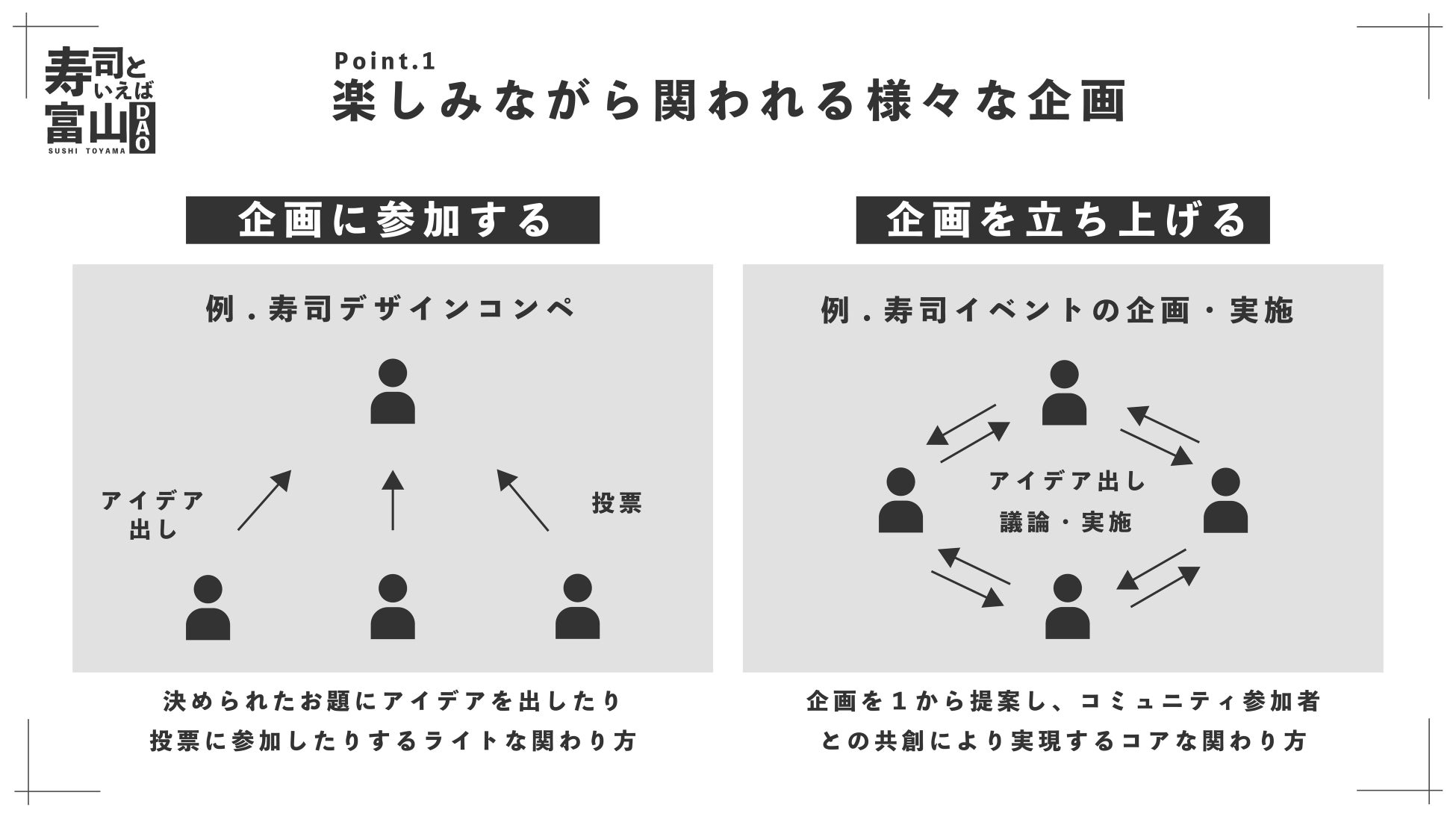 コミュニティ内では、例えば、インバウンド客が思わず写真を撮りたくなる「寿司デザインコンペ」や「富山の寿司の魅力を広げるイベント企画・開催」など、楽しみながら参加者の興味の程度に応じて富山の寿司ブランディングに関わることができる様々な企画を行います。