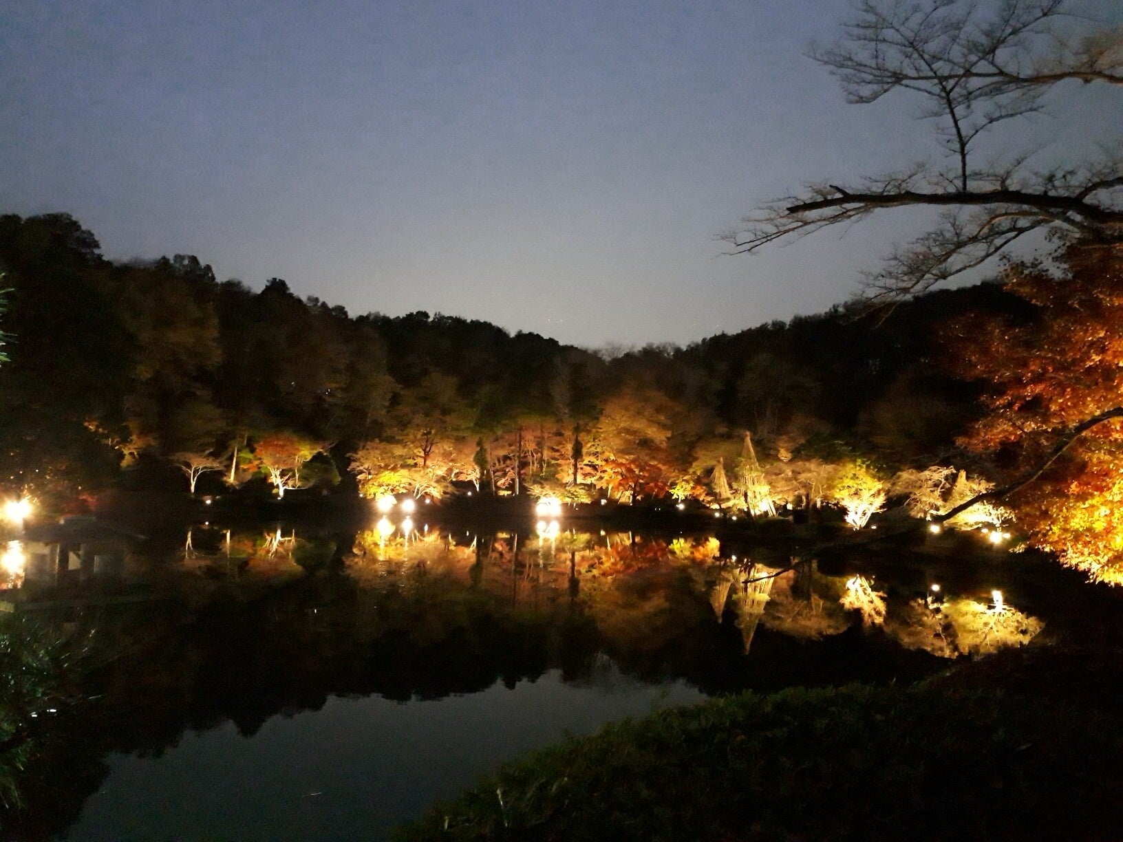 薬師池の幻想的なライトアップが魅力