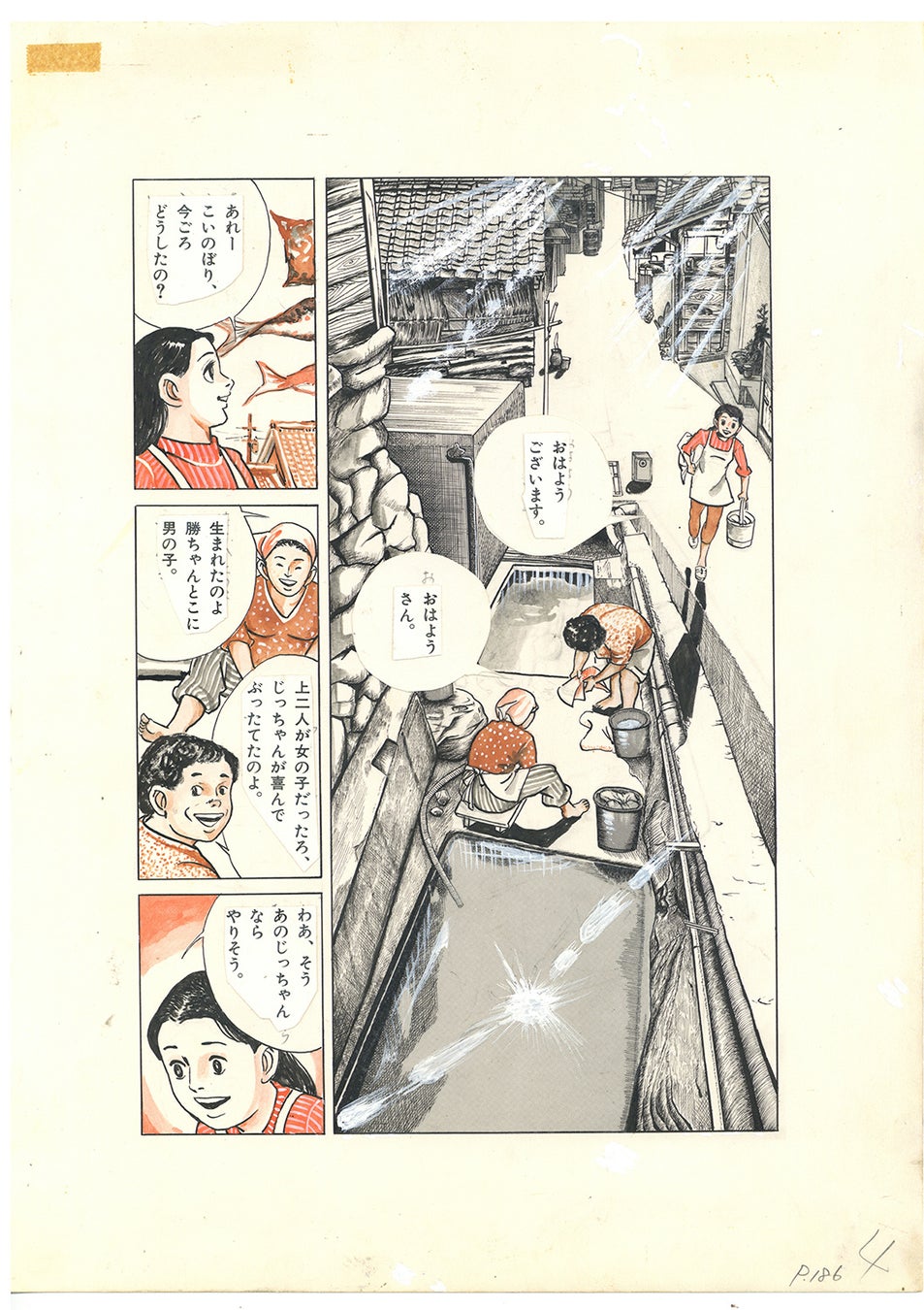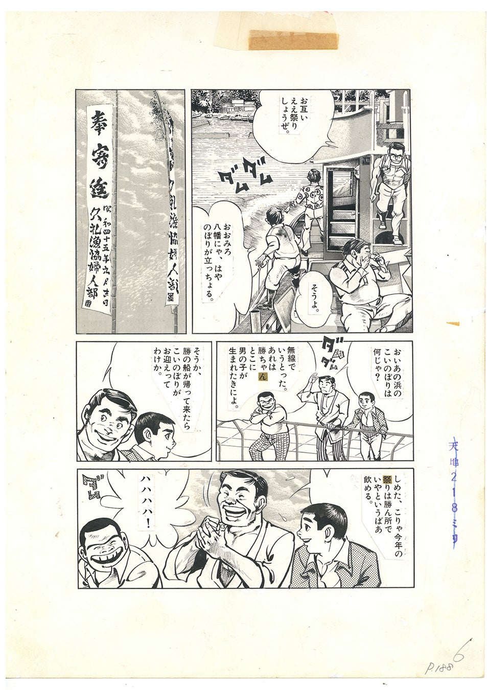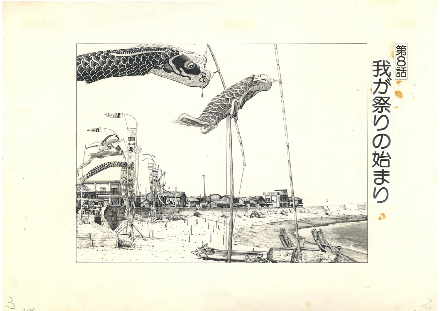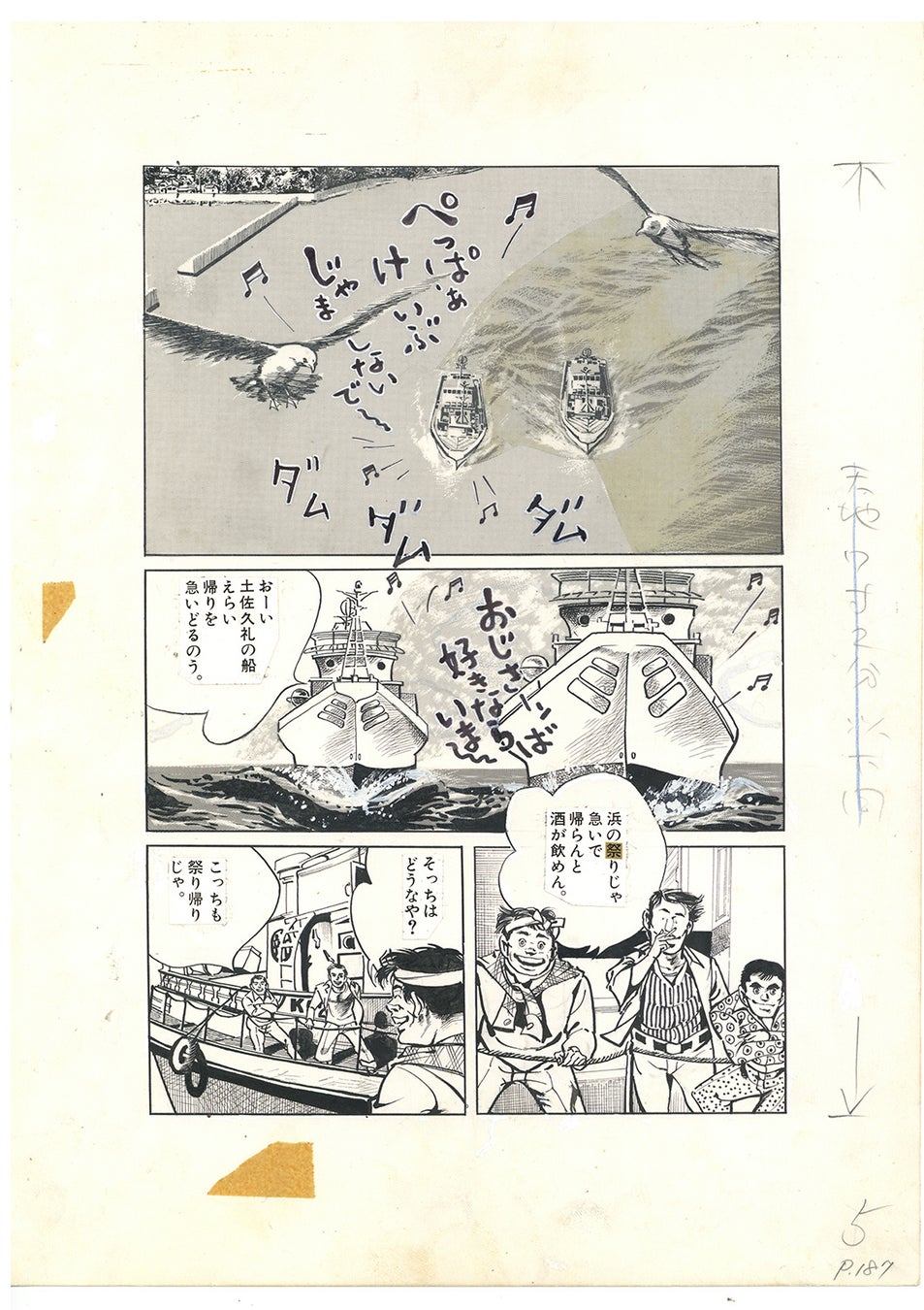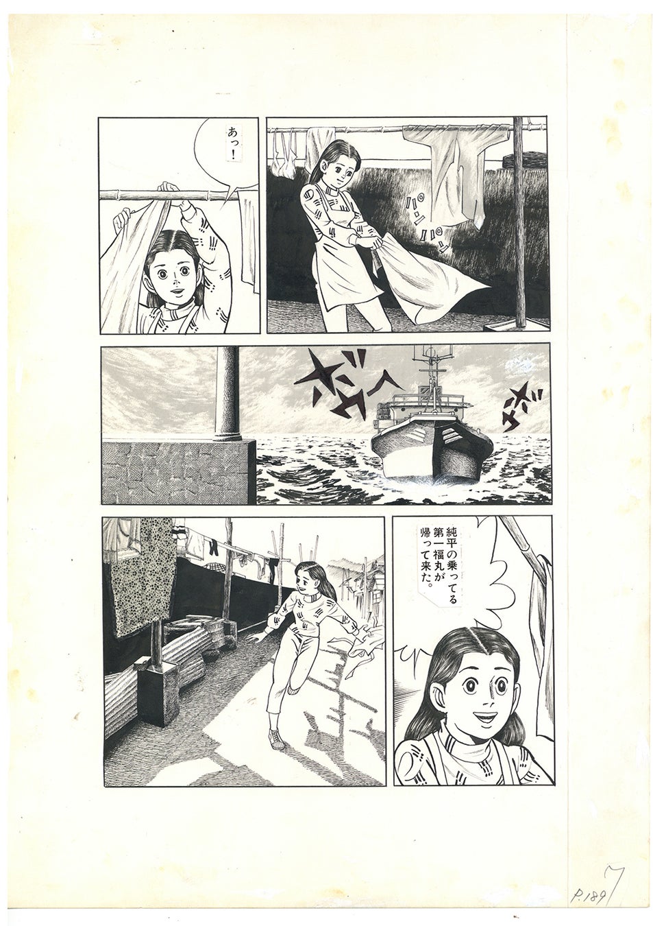 今回のヤフーオークション(ギャラリーダヴィンチ ヤフオク!店)への出品は一番の代表作と言える『土佐の一本釣り』。初回は冒頭第8話の港の全景の見開き原稿です。まさに『土佐の一本釣り』を象徴する印象的なシーンです(ヤフーオークションにてすでに落札済み)。青柳作品の原画が販売されたことは過去になく、またマンガ原画は世界に1枚しかない1品ものです。是非この一期一会を逃さないでください。