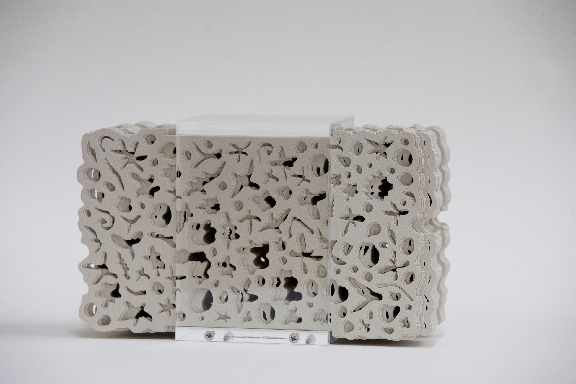 もう⼀つの空間を彩るのは、記憶の断片を即興で切り抜いた『こもれびシリーズ』の彫刻作品。様々な形に切り抜いた紙を何層も重ねた作品『Paper Love』や、新作のモビールをインスタレーション形式で展⽰します。