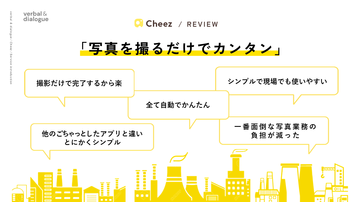 Cheez is an application that utilizes AI to instantly generate a comprehensive construction photo ledger. A task that previously demanded 90 hours can now be accomplished in just 1 second. With its overwhelming convenience, it will become an ``indispensable'' part of your construction photography business.