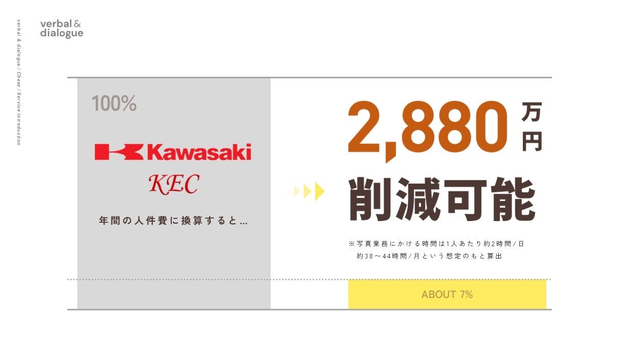 写真帳業務にかける時間は1人あたり約2時間/日。約38〜44時間/月という想定のもと算出すると、20人の事業所様ですと、年間2880万円のコスト削減につながります。また空いた時間で他の業務が出来るため、全体の生産性が向上にも繋がり、人手不足に対し大きな効果と影響をもたらすことが可能です。