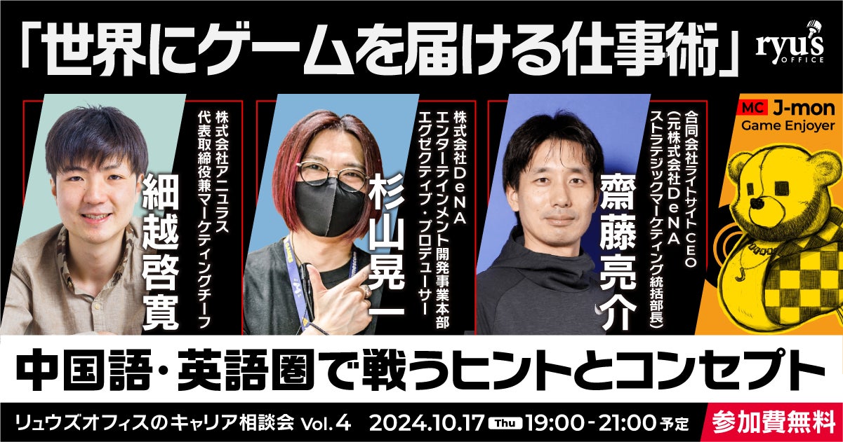 今回は、グローバルのゲームマーケティング経験者である齋藤亮介氏(合同会社Right Sight)、海外展開ゲームのプロデュース経験のある杉山晃一氏(株式会社ディー・エヌ・エー)、中国語圏向けのマーケティングサービスを手掛ける細越啓寛氏(株式会社Annulus)をゲストに迎え、MCはINDIE Live Expo、BitSummitなどでMCを担うJ-mon氏が務めます。