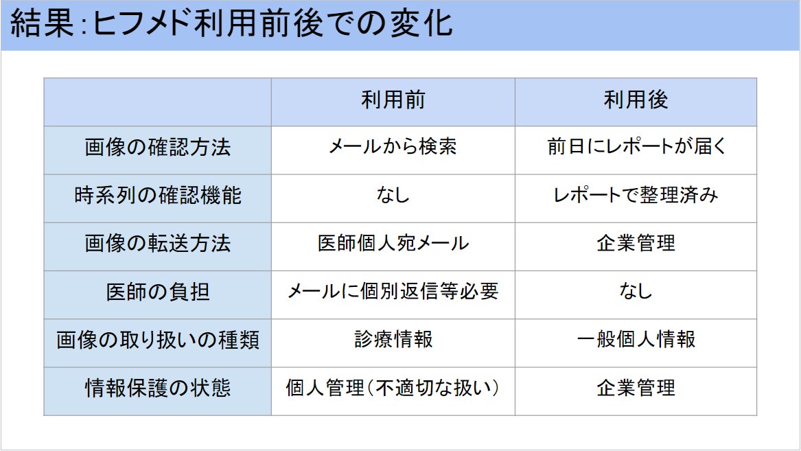 オンライン診療の補助としてヒフメドを導入し、患者との画像のやり取りを円滑に行う方法を検討しました。これにより、医師個人宛にメールで画像を送信する手間や規定・規則上の問題を解消し、セキュリティ上の問題も解決しました。