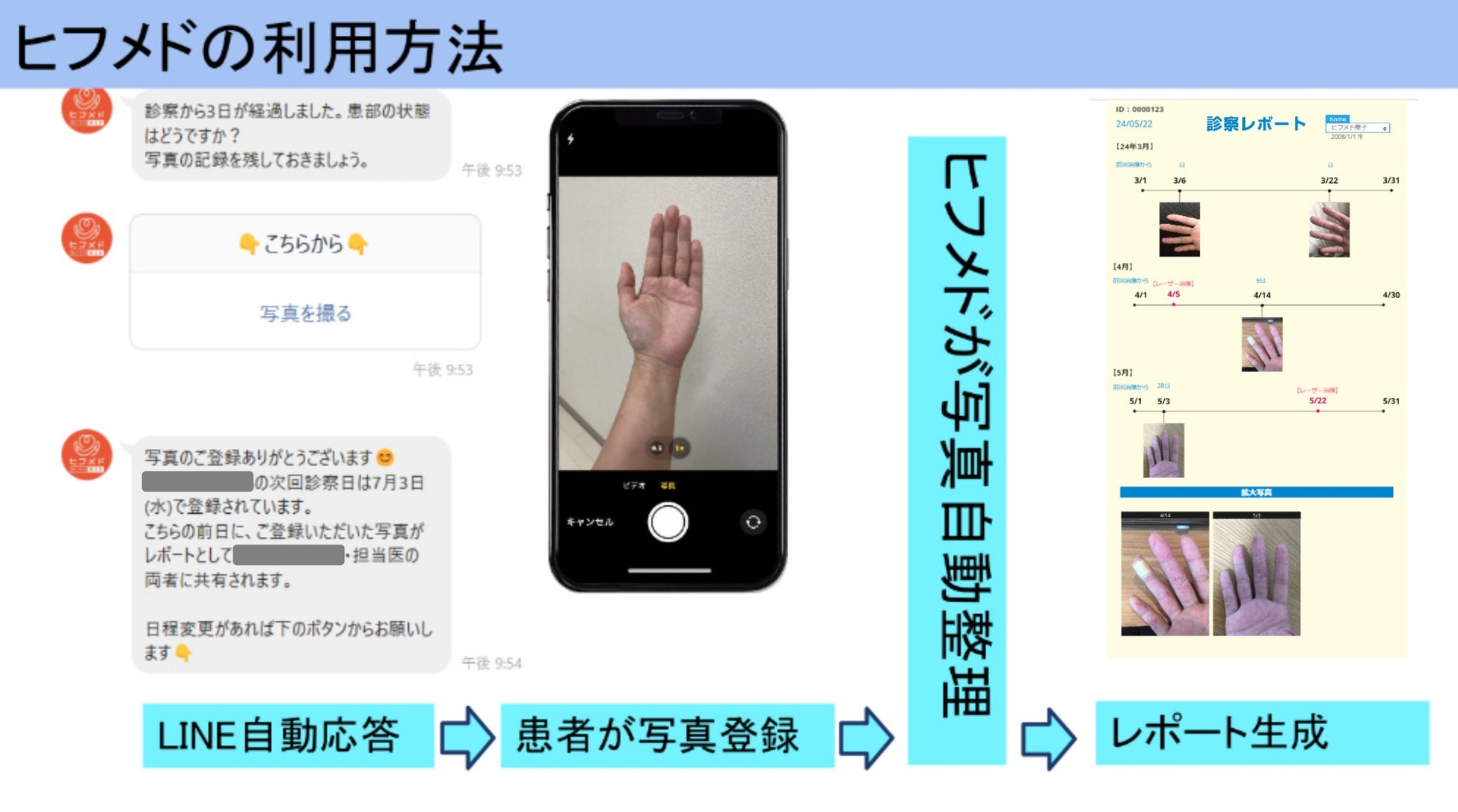 患者はLINEで通知を受け取り、診察日の登録や患部の経過観察写真、異常があった際の写真と特徴などを登録し、その情報がレポートにまとめられて担当医にメールで送信されます。