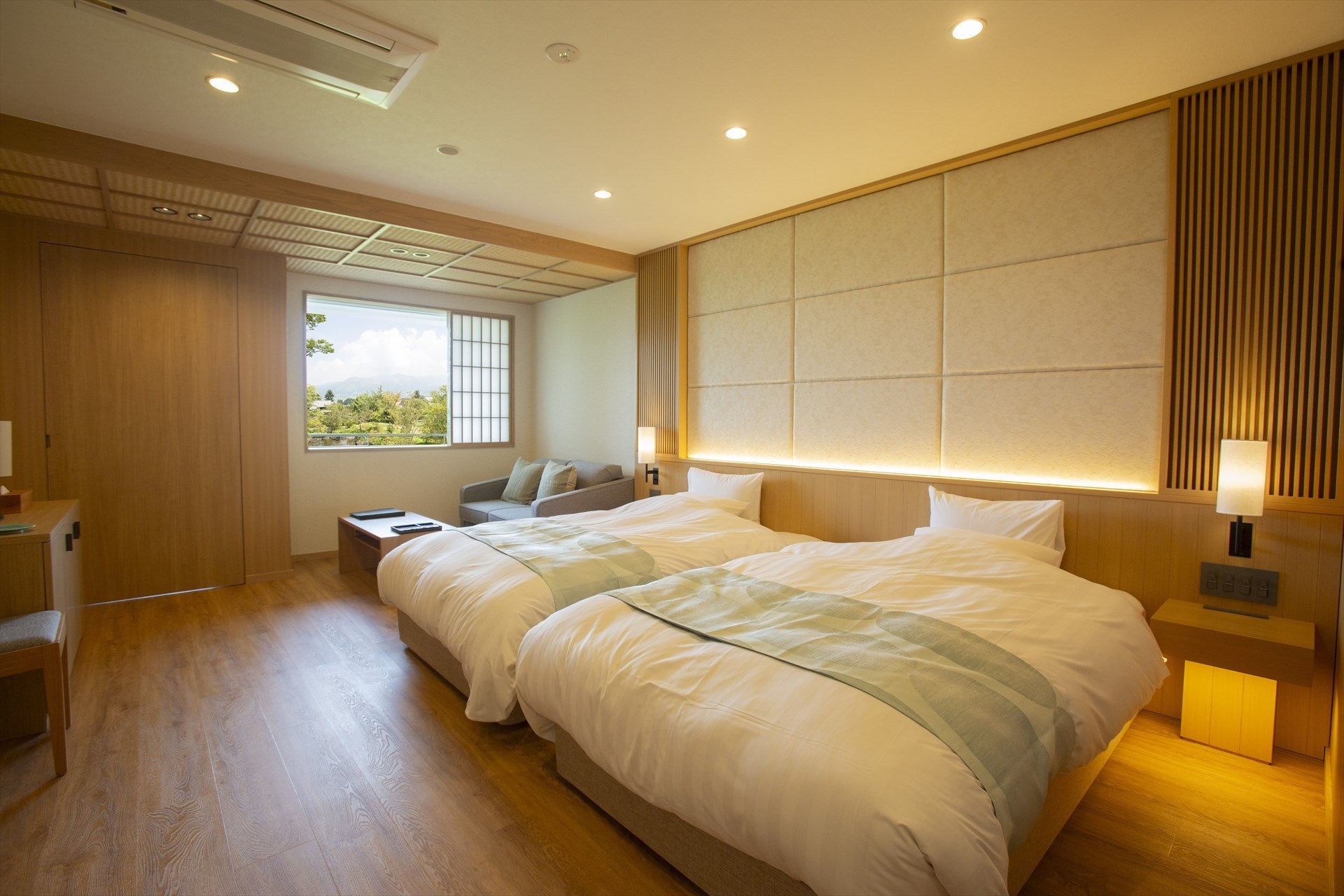 また、2024年7月には全客室の改装が完了し、四季折々の庭園や阿蘇の山々を一望できるように設計されています。客室内も白木と薄いグリーンをアクセントに取り入れたインテリアが特徴で、木と自然の暖かみを感じさせる空間が広がります。