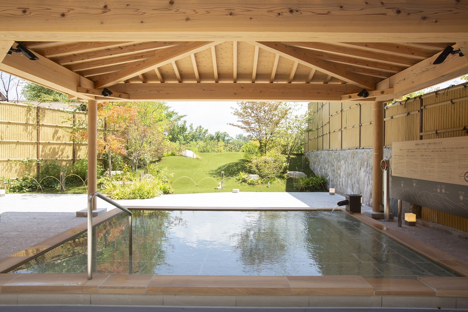 2024年3月に整備された「ホテル夢しずく」の大露天風呂は、新しいコンセプトで設計されています。以前までのゴロゴロとした岩が特徴的な、伝統的な温泉スタイルではなく、「和」と「洋」が巧みに融合したモダンで上質な雰囲気の温泉へと生まれ変わりました。