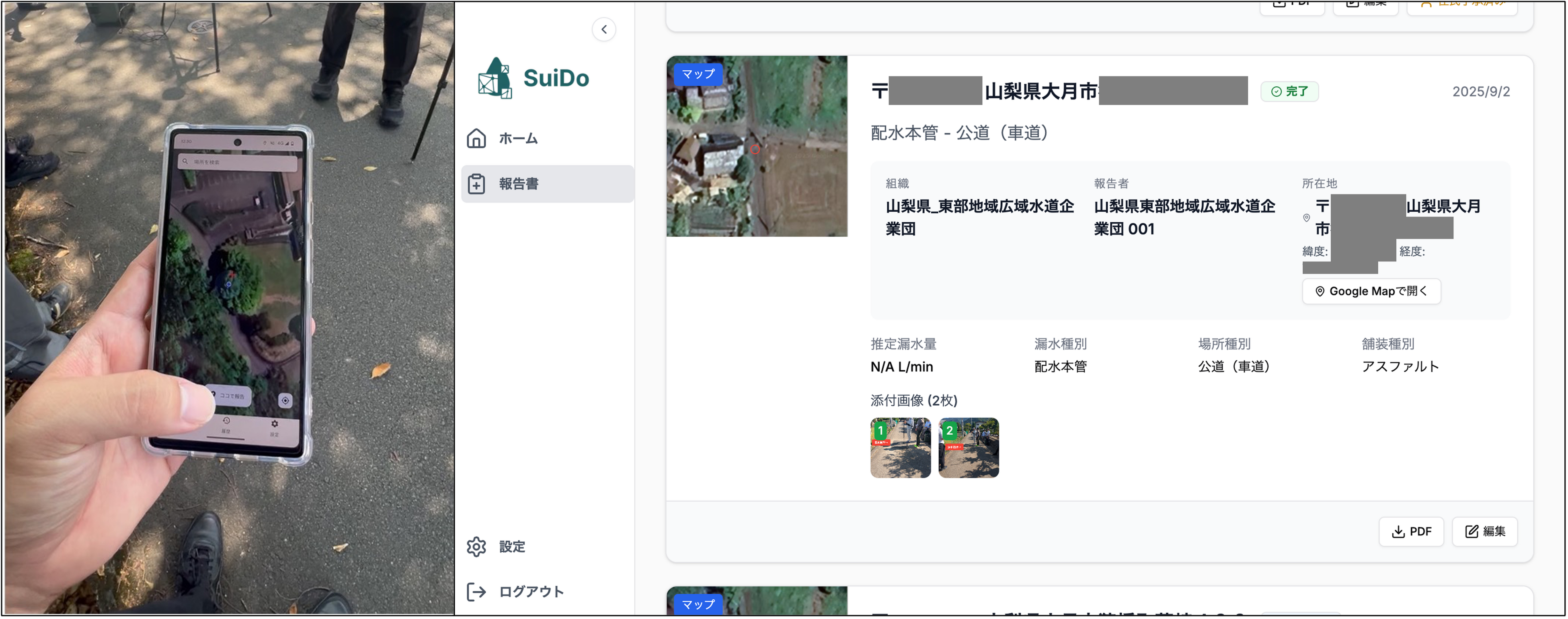「SuiDo-DX」は、漏水調査の現場で撮影した写真や位置情報を、従来の報告内容にあわせてスマートフォンから簡単に送信できるアプリです。これまで調査会社が現場で調査を終えた後、30分以上かけて報告書を作成し、提出・移動までを行っていた業務が、わずか2分で完了するようになりました。