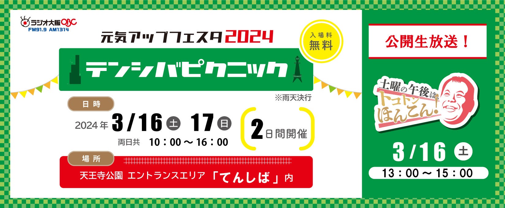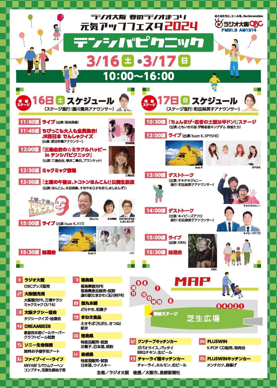 ラジオ大阪(OBC、大阪放送株式会社)は、3月16日(土)・17日(日)、春のラジオまつり『ラジオ大阪 元気アップフェスタ2024 テンシバピクニック』を開催します。