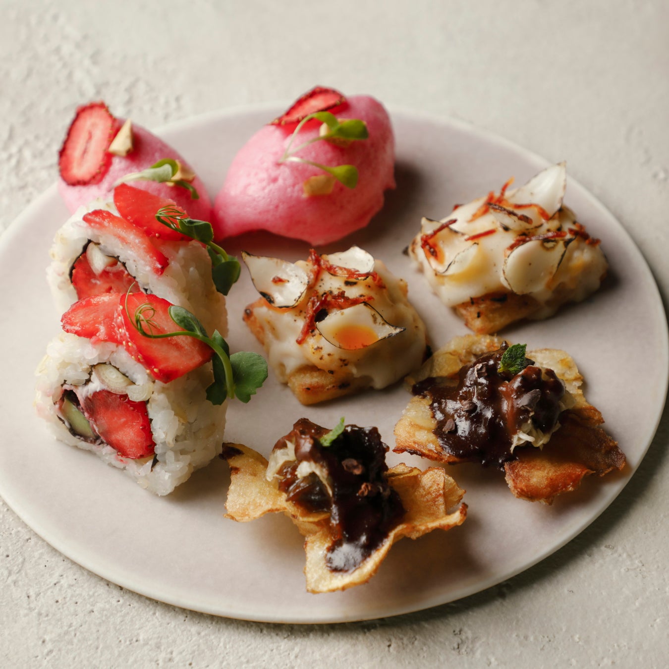 立春の上生菓子(京菓子司「亀屋良長」作)、いちご寿司、牛ほほのバルバコア、甘鯛のいちごギモーブ、ゆり根のグラタン、白みそスコーン、発酵いちごとカカオのスコーン、あまおういちごジャム、甘酒クリーム
