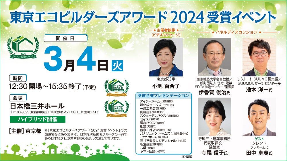 3月4日には、「東京エコビルダーズアワード2024受賞イベント」が開催されます。同イベントでは、セイズを含むリーディンカンパニー賞を受賞した企業15社によるプレゼンテーションに加え、ゲストによるパネルディスカションが予定されています。