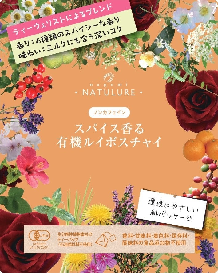 株式会社大和は資材メーカーとともに工程の工夫を重ね、紙素材の風合いを活かしつつも、なごみナチュルアブランドデザインである世界のハーブティーやお茶、コーヒーの花柄のデザインの再現性が高い包材に仕上げてあります。