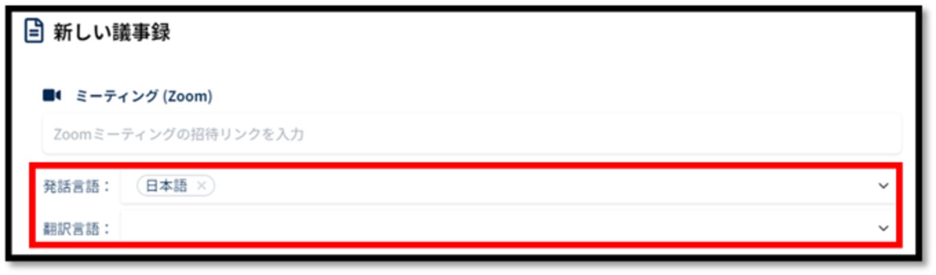 ①新規議事録よりオンライン会議からを選択いただくと画面より発話言語/翻訳言語を指定できます。