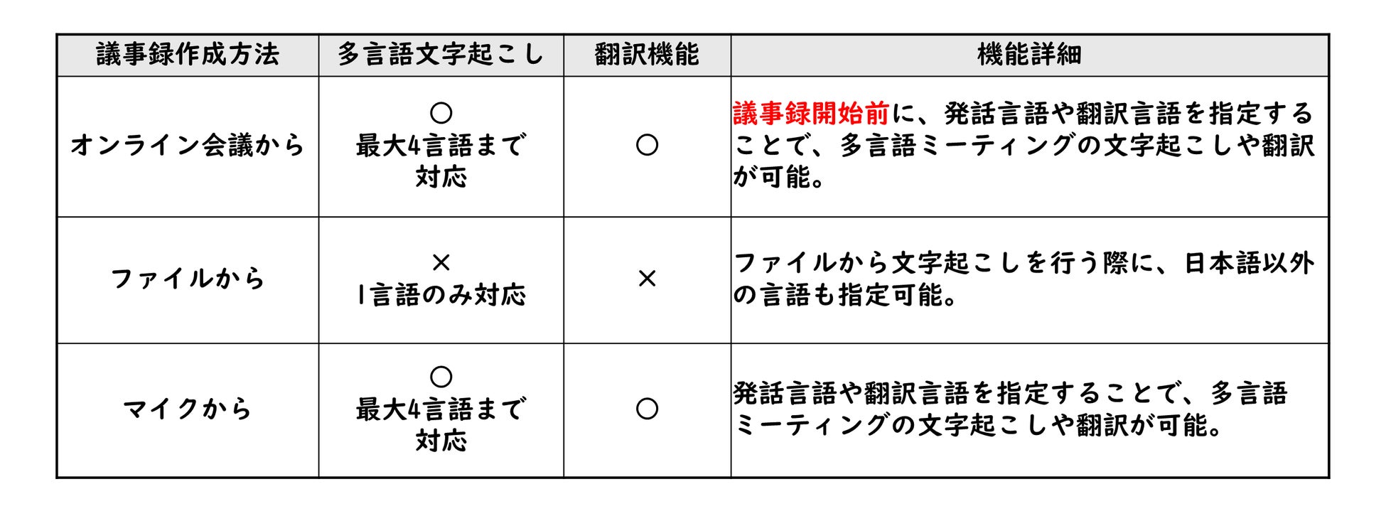 これまでオンライン会議から議事録を作成する場合、日本語のみの文字起こしが可能でしたが、事前に言語を指定していただくことで、多言語によるミーティングでも文字起こしが可能となっております。