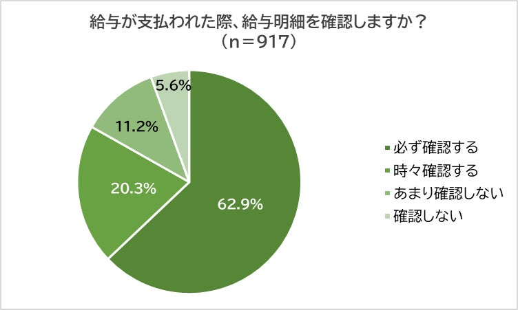 社会人2年目以上の917人に「給与が支払われた際、給与明細を確認するか?」訊きました。6割超(62.9%)が「必ず確認する」と最多で、以下「時々確認する」(20.3%)、「あまり確認しない」(11.2%)となり、「確認しない」(5.6%)もわずかにいました。