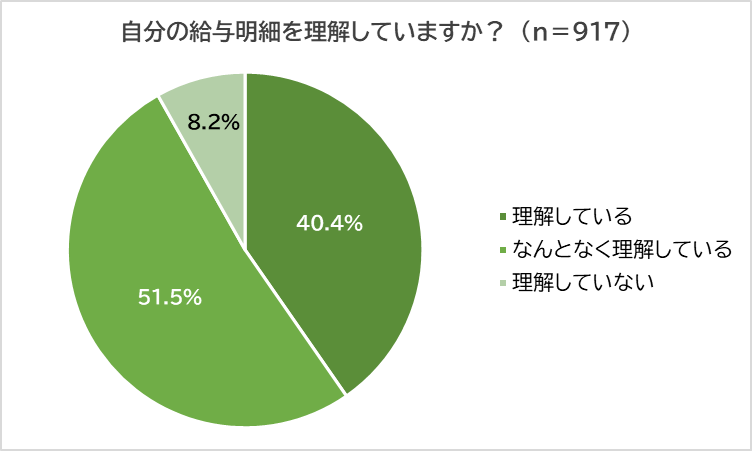続いて、「自分の給与明細を理解しているか?」と訊いたところ、「理解している」(40.4%)、「なんとなく理解している」(51.5%)、「理解していない(8.2%)となり、約6割が正確に理解していないことがわかりました。