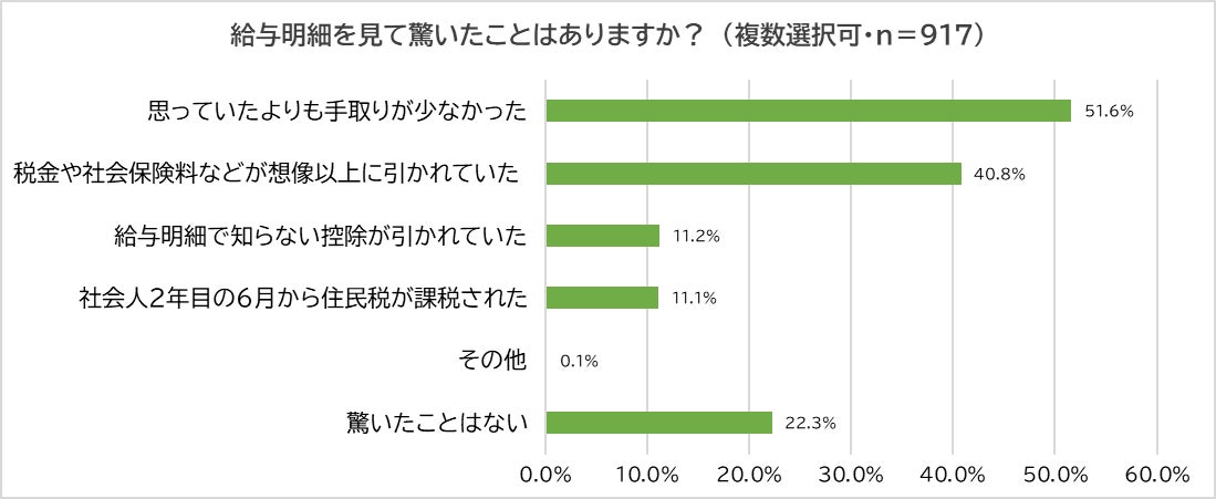 最後に、「給与明細を見て驚いたことはあるか?」訊いたところ、「思っていたよりも手取りが少なかった」(51.6%)と「税金や社会保険料などが想像以上に引かれていた」(40.8%)が目立ちました。