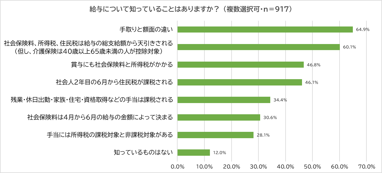 それでは、「給与についてどんなことを知っているか?」訊いてみました。最多は「手取りと額面の違い」(64.9%)、以下「社会保険料、徒食税、住民税は給与の総支給額から天引きされる」(60.1%)、「賞与にも社会保険料と所得税がかかる」(46.8%)、「社会人2年目の6月から住民税が課税される」(46.1%)と続きました。これにより、手取りと額面の違いがわからない人は4割弱(35.1%)、賞与にも社会保険料と所得税がかかることを知らない人が4割(39.9%)もいることがわかりました。