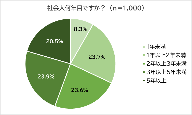 まず、「社会人何年目か?」と訊いたところ、「1年未満」(8.3%)、「1年以上2年未満」(23.7%)、「2年以上3年未満」(23.6%)、「3年以上5年未満」(23.9%)、「5年以上」(20.5%)となりました。