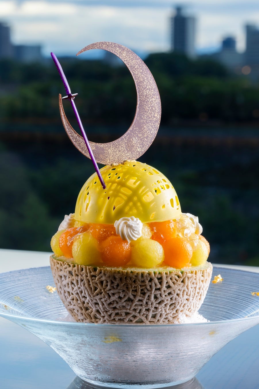 その名も「“SAMURAI”かき氷」と名付けられたイチ押しかき氷は、2 種類のメロンをダイナミックに 1 玉使用。丸くくり抜いた2色メロンをかき氷の上にたっぷりとかざり、フレッシュ青肉メロンソースとメロンエスプーマ、レモンジュレで爽やかな味わいをプラス。侍の兜をイメージしたチョコレート中には、バニラアイスクリームも入っており、飴細工の刀剣が威風堂々とした姿を引き立てます。周りには、金箔をあしらった豪華な一品です。お好みで、フレッシュ赤肉メロンソースをかけながらお楽しみください。