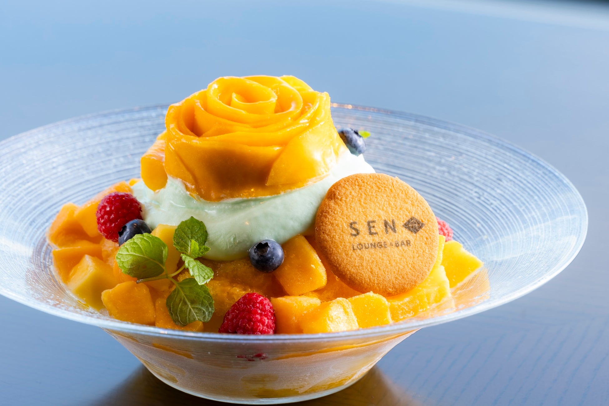 「マンゴーかき氷 ミント香るヨーグルトエスプーマ マンゴーとパパイヤ添え」は、華やかな着物をイメージ。花びらのように配されたたっぷりのフレッシュマンゴーと、ほんのりミントが薫るうす緑色のヨーグルトエスプーマとのカラーコントラストが魅力です。やさしい甘みのパパイヤと酸味のベリーフルーツに加えてふわふわ食感のエスプーマで、暑い夏でも、さっぱりとお楽しみいただけるかき氷です。