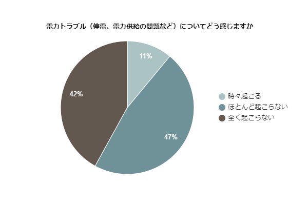 電力トラブルについて調査したところ「ほとんど起こらない」が47%、「全く起こらない」が42%と、合わせて約9割が電力トラブルについて起こりづらいと感じているようです。
