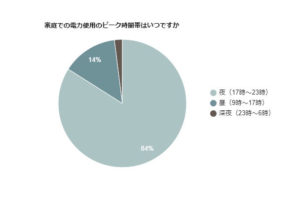 家庭での電力使用のピークを調査すると、17時~23時の夜間帯が84%と多い結果となりました。