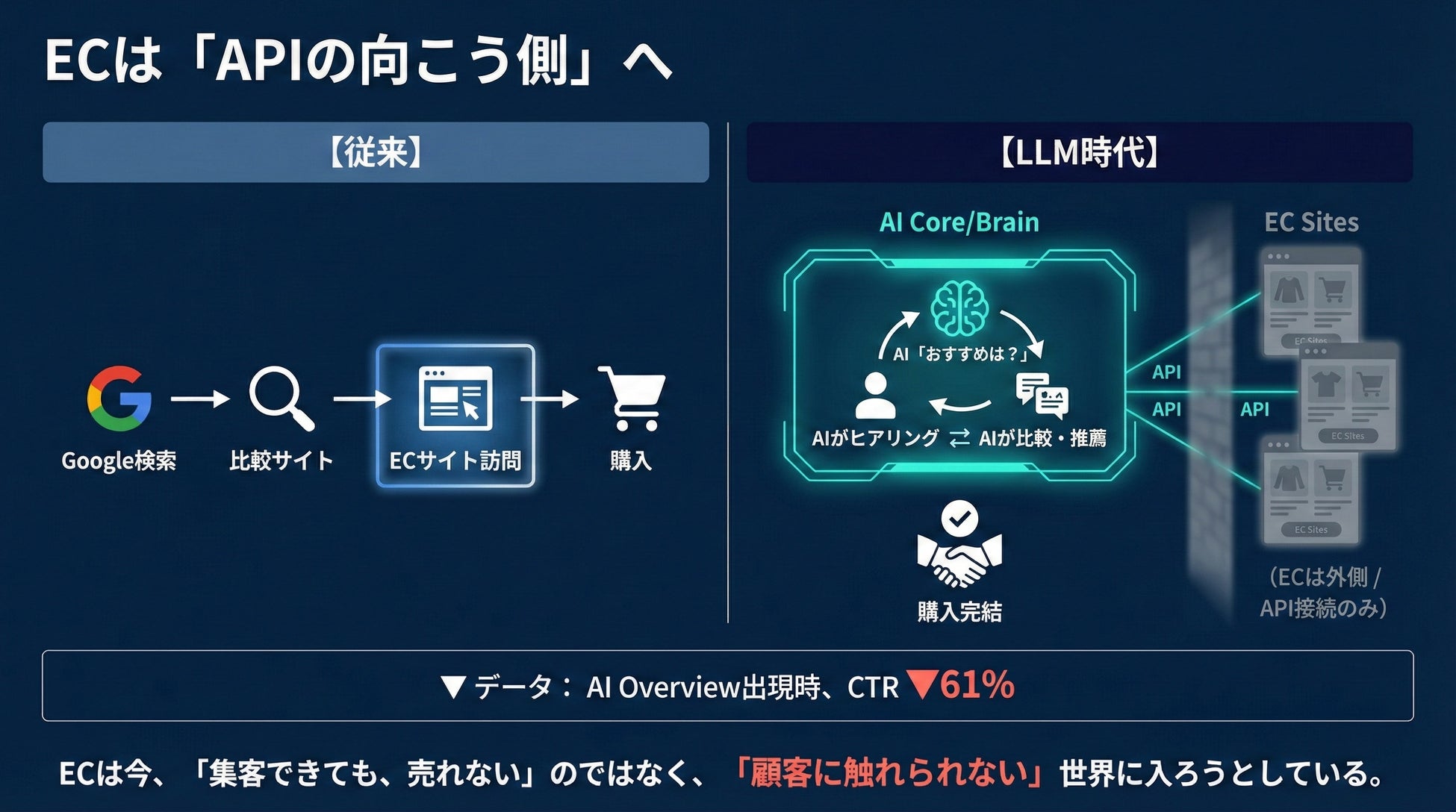 ひとつは、広告費をかけて構築してきた集客導線がAIプラットフォームに吸い上げられ、自社ECが「APIの向こう側」——消費者から見えない裏方——に追いやられること。