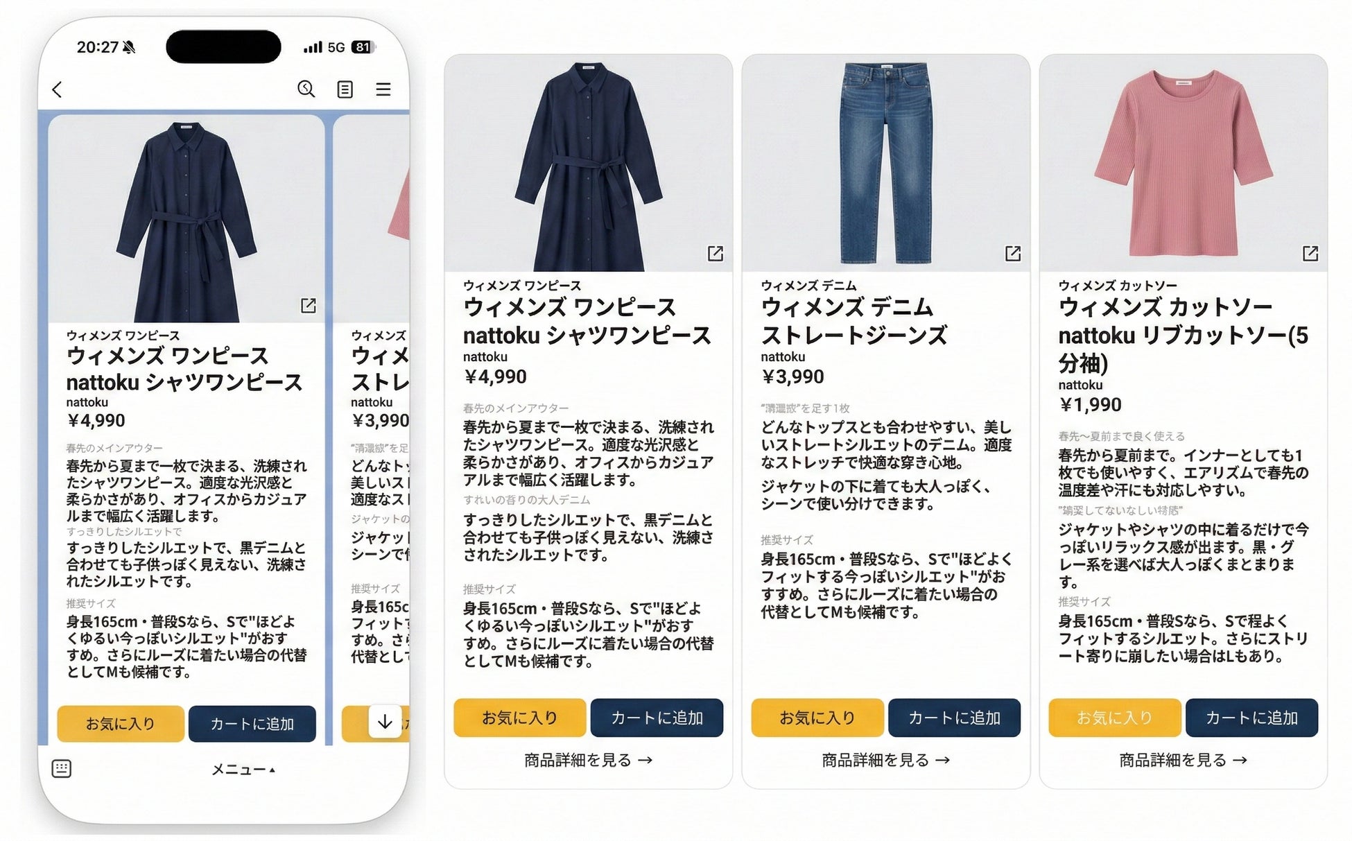 この環境下でEC事業者が生き残るには、「AIプラットフォームでは代替できない顧客体験」を自社で持つ必要があります。汎用AIが行うのは「情報の整理と提示」ですが、nattoku.aiが行うのは「お客様の迷いを理解し、納得を醸成する接客」です。お客様一人ひとりの状況に寄り添い、ブランドの文脈の中で「なぜこの商品があなたに合うのか」を語る。この体験は、汎用的なAIショッピング機能では再現できません。
