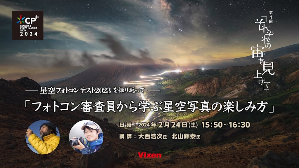 総合光学機器メーカー株式会社ビクセン(本社:埼玉県所沢市、代表取締役:新妻和重)は、2024年2月22日(木)~25日(日)まで、パシフィコ横浜での会場イベントとオンラインイベントのハイブリッドで開催される「カメラと写真映像のワールドプレミアムショー『CP+2024』」に出展します。会場では新製品をはじめとするビクセン製品やセレストロン製品を展示するとともに、セミナーステージにてトークショーを行います。