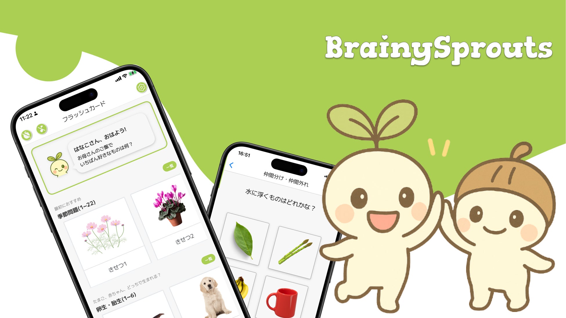 小学校受験対策や小学校入学準備用のアプリとして好評をいただいている『BrainySprouts』には、新たに「スプラッコちゃん」・「チビタネくん」の2キャラクターが加わりました。