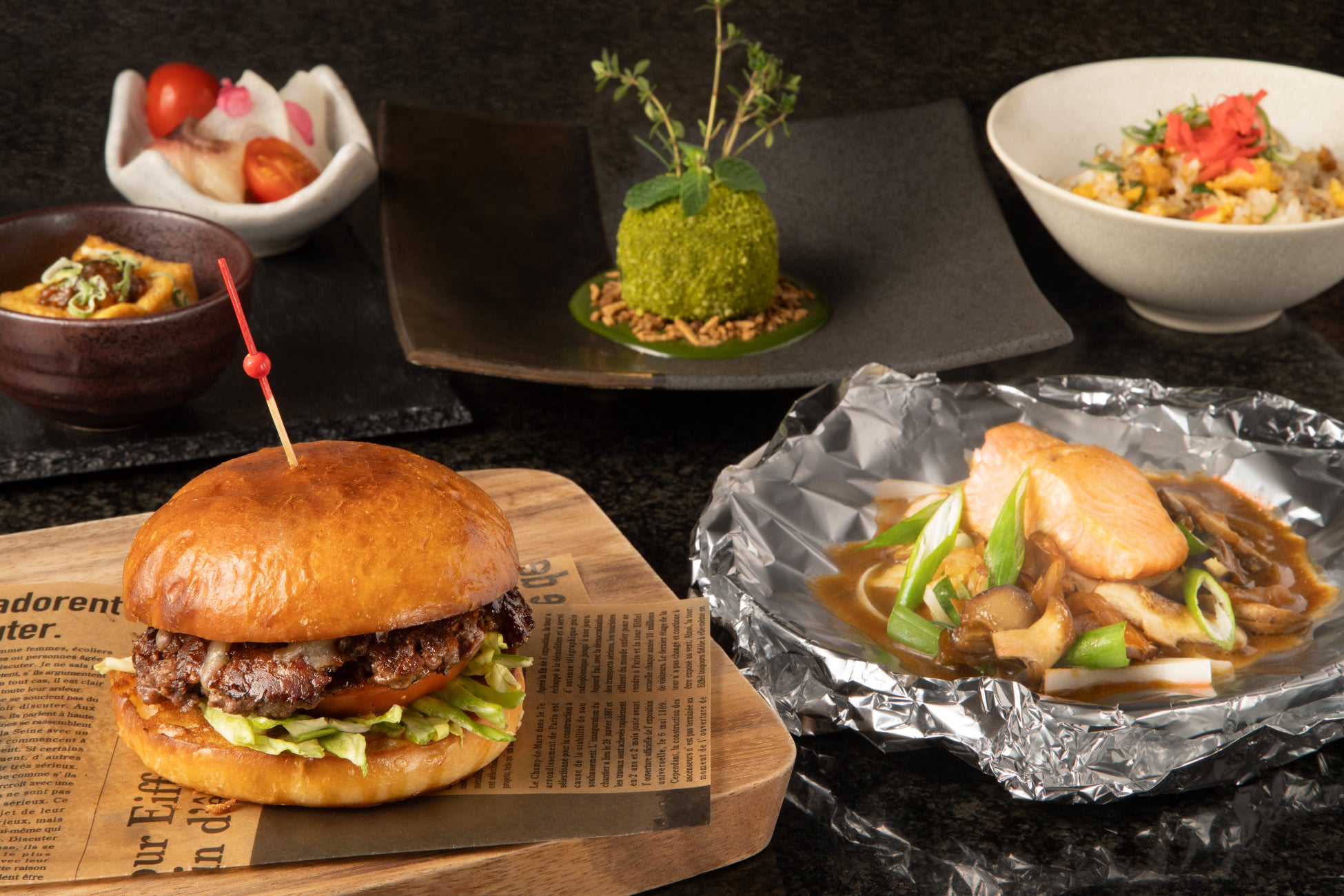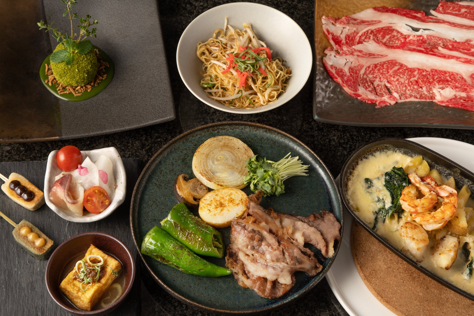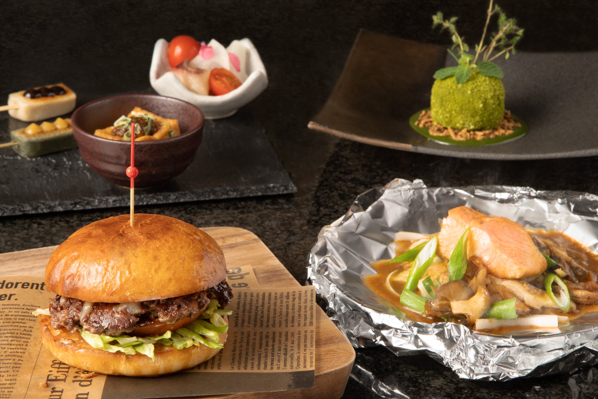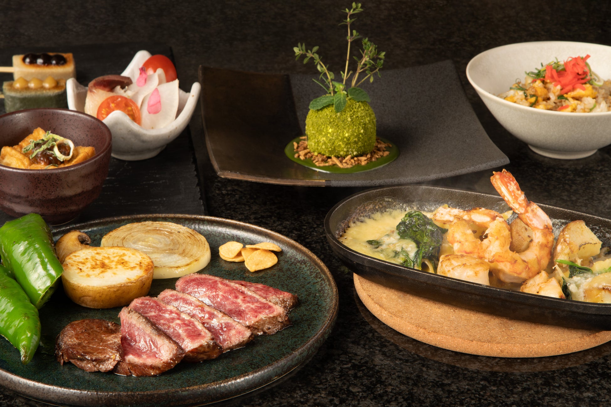 まずはシャンドン ロゼまたはノンアルコールスパークリングのウェルカムドリンクで乾杯を。前菜は、京都の食文化を楽しむ“おばんざいスタイル”で3種のメニューを小さなポーションにして程よくお召し上がりいただきます。「京豆腐 とようけ屋 山本」の厚揚げ豆腐をカリッと焼きあげ湯葉あんかけをかけた一品や、「半兵衛麸」の京生麩の田楽など、京都が誇る老舗店の食材を一度に体験できる贅沢なコースの始まりです。魚料理は、香ばしい味噌の風味とふんわりと蒸し焼きにしたサーモン、野菜の優しい味わいが凝縮された「鮭のホイル包み焼味噌仕立て」または、鉄板焼きで仕上げるチーズたっぷりのシーフードグラタン「海老と帆立貝の鉄板焼き グラタン仕立て」からお選びいただけます。次に肉料理は、開業以来不動の人気を誇る「ダブルスマッシュバーガー」または「黒毛牛焼きしゃぶの野菜添え」をご用意いたします。そして〆のメニューは、朝食で行列ができるほど人気の卵麺とあっさり醤油スープが絡んだ「朝ラーメン」を鉄板で調理した「焼きラーメン」に。または鉄板料理の〆の定番「ガーリックチャーハン」のいずれかからお選びいただけます。デザートには、館内に点在する盆栽アートをモチーフにしたアイコニックなシグネチャースイーツ「盆栽ティラミス」をご提供し、特別なディナーの締めくくりを演出します。