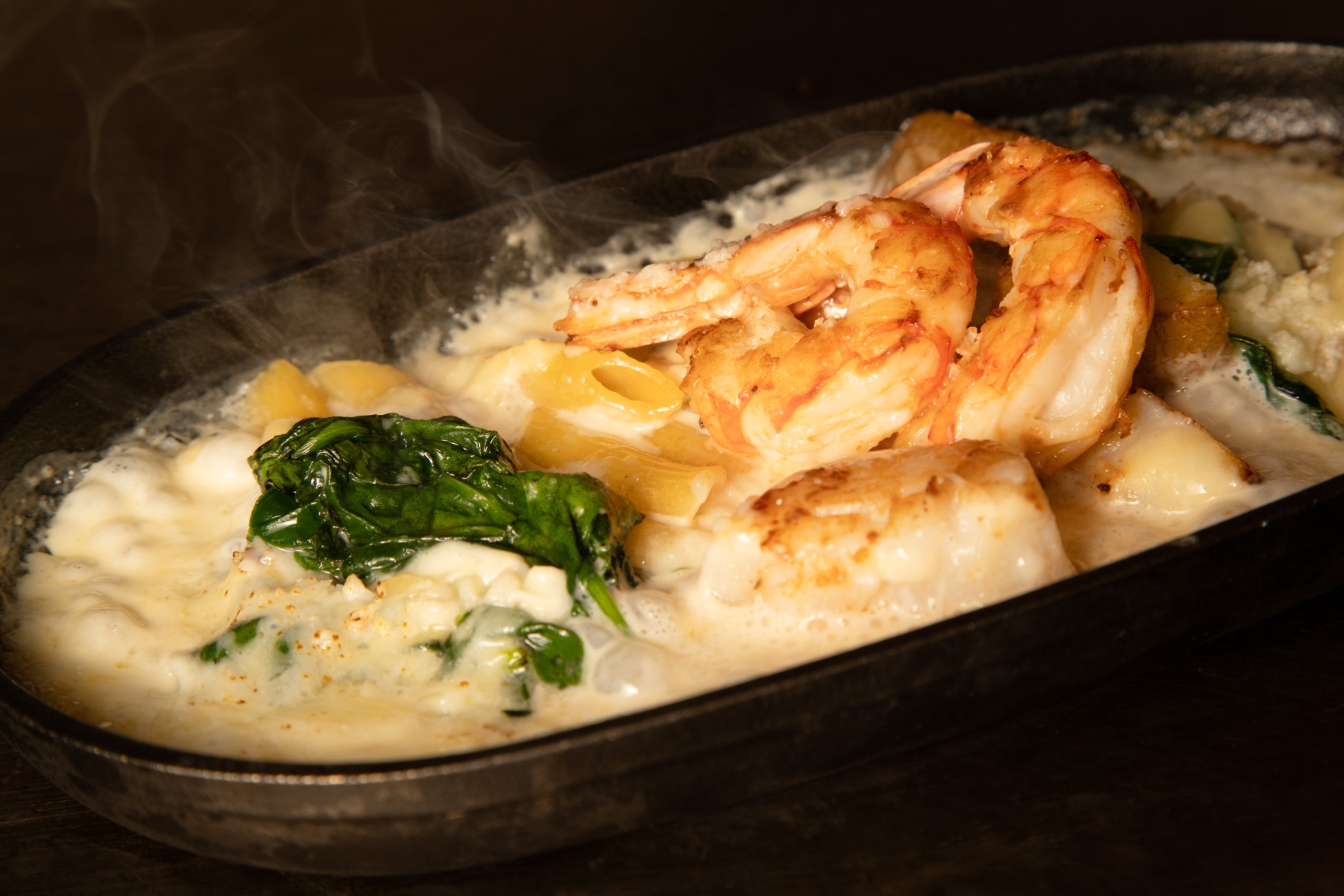 ・お魚料理 海老と帆立貝の鉄板焼き グラタン仕立て