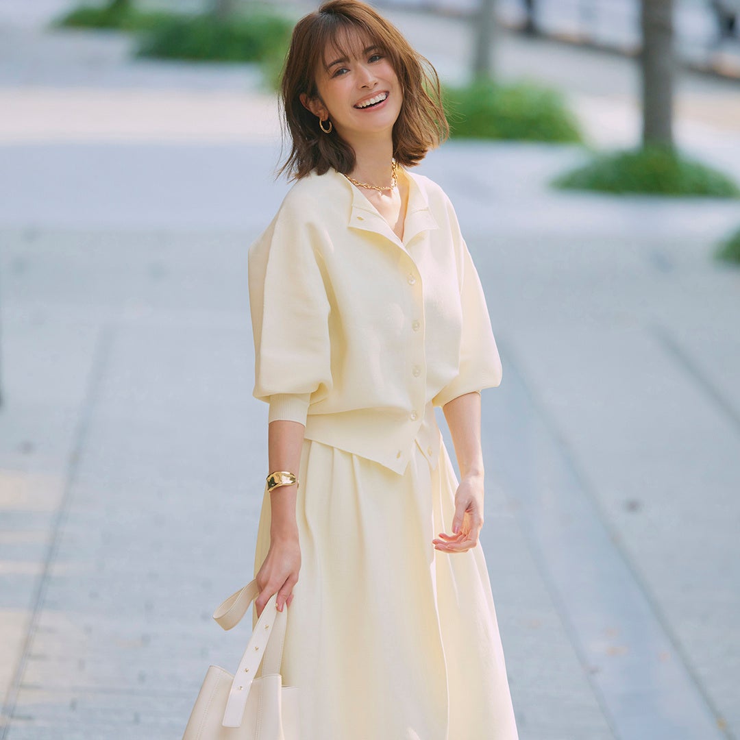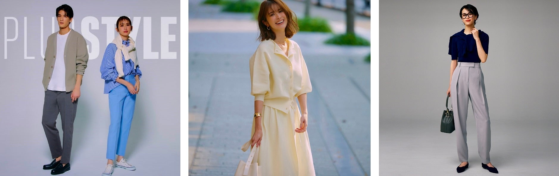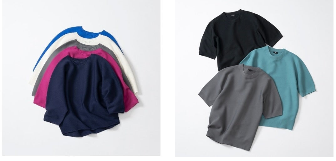 「体のラインを拾いにくくスタイルが良く見える」と人気のニットは、程よい厚みと肉感がある素材で夏にも涼しく着られる肌触りです。前後2WAYで着られる半袖セーターと、金ボタンがアクセントになっているカーディガンはアンサンブルとして着ることも可能。涼しげなグリーンとブルーの店舗限定カラーが登場します。