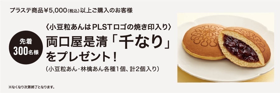 3月8日(金)にユニクロ名古屋店内にオープンするプラステ名古屋店では、5千円(税込)以上ご購入のお客様に、両口屋是清「千なり」をプレゼントいたします。小豆粒あん・林檎あん各種1個、計2個入りで、小豆粒あんにはPLSTロゴの焼き印が入っています。※先着300名様、なくなり次第終了となります。