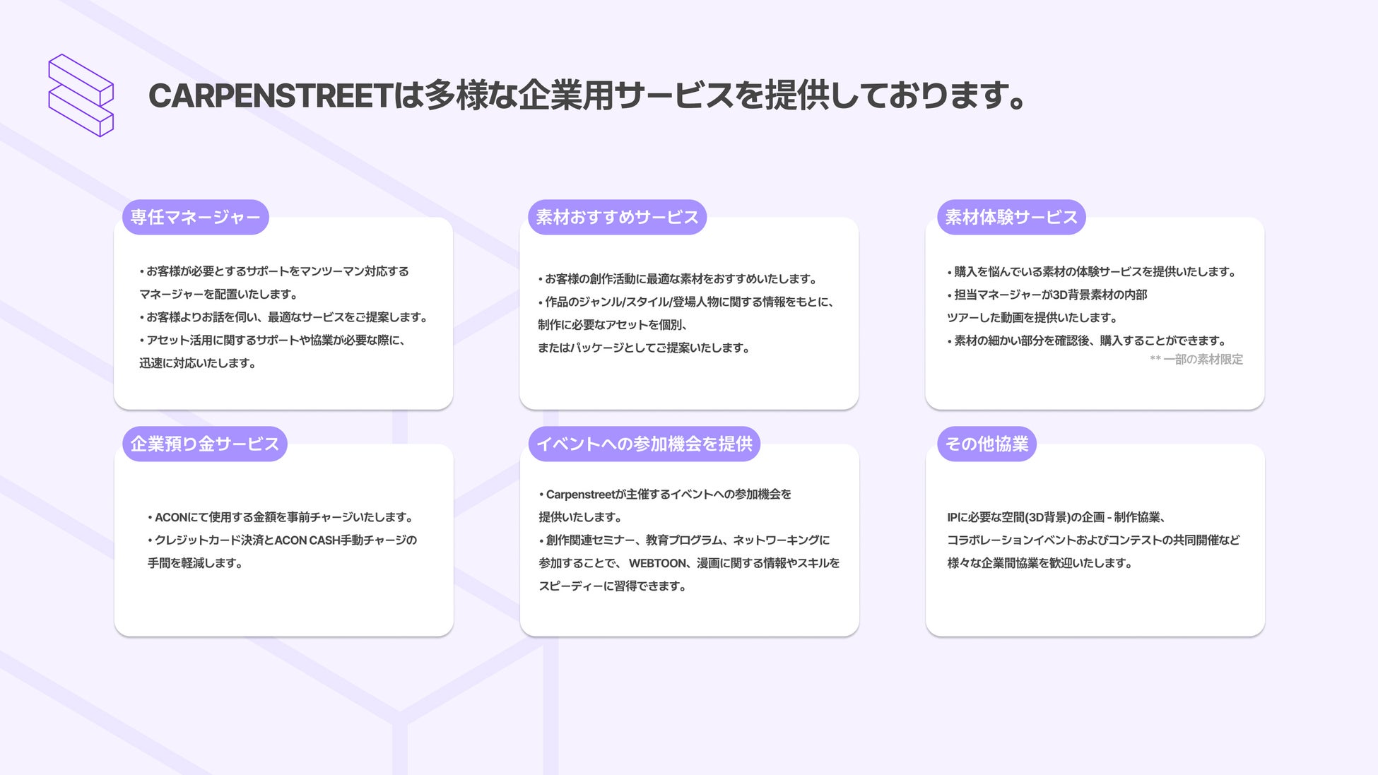 企業のお客様にCarpenstreetが主催するイベントに参加する機会を提供いたします。創作関連セミナー、教育プログラム、ネットワーキングイベントを通じ、WEBTOONや漫画関連の最新情報を手に入れる機会をご用意しました。