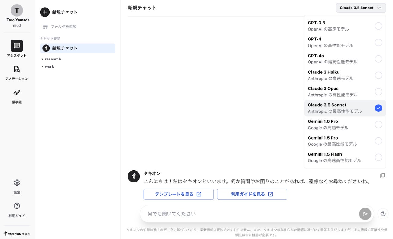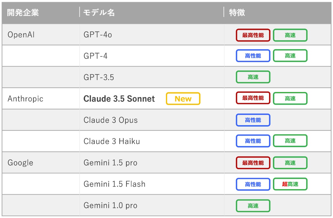 「Tachyon 生成AI」では、OpenAI社が開発するLLM「GPT」、Google社開発「Gemini」、Anthropic社開発「Claude 3/3.5」を搭載しています。今回追加された最新のLLM「Claude 3.5 Sonnet」を含めて、以下9つのモデルをご利用いただけます。