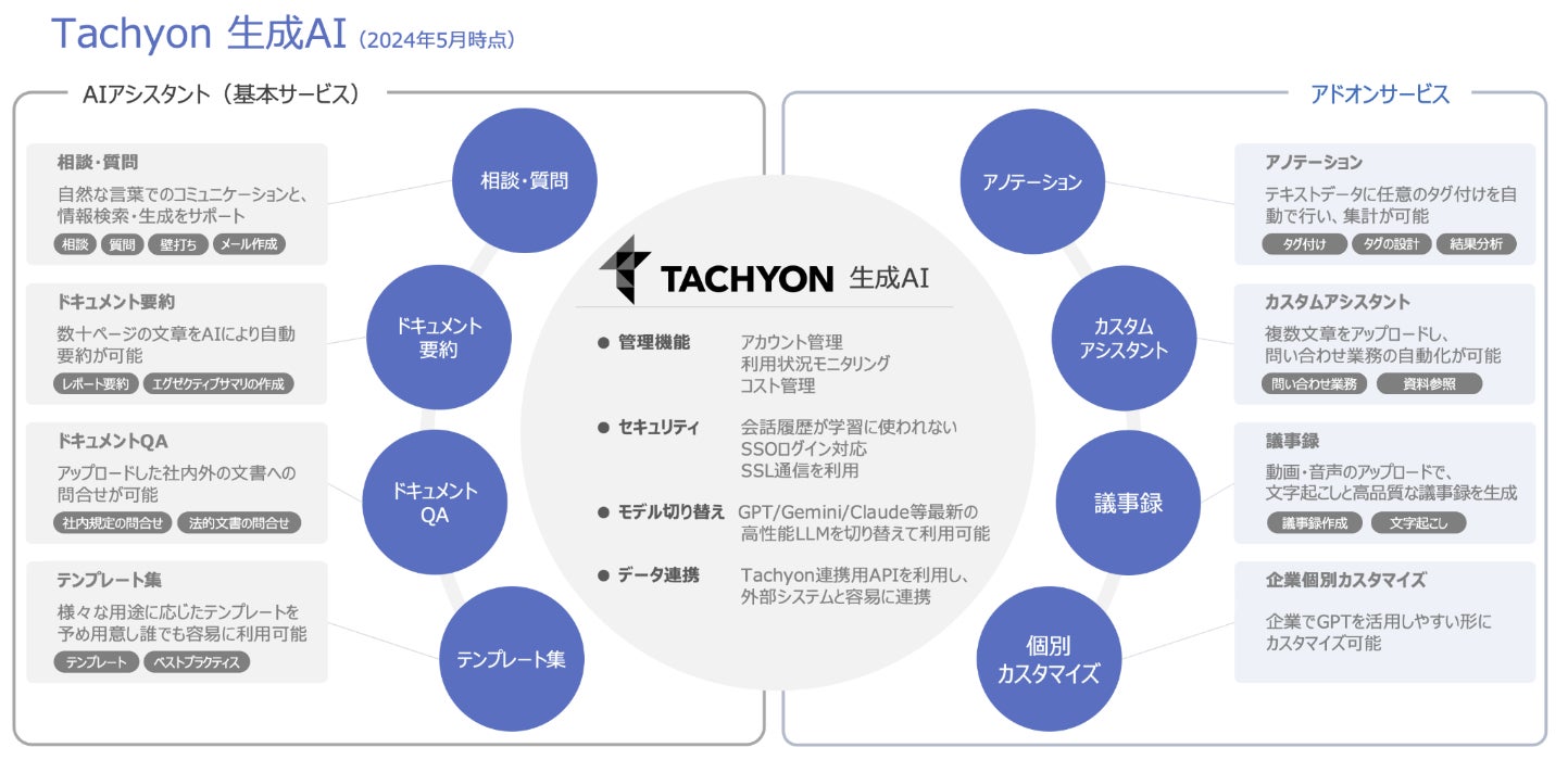 「Tachyon 生成AI」においては、本アップデートに伴い既存モデル「Claude 3 Sonnet」を「Claude 3.5 Sonnet」にアップデートし、前シリーズの最高精度モデル「Claude 3 Opus」と高速モデル「Claude 3 Haiku」を含めた3モデルのご利用が可能となります。