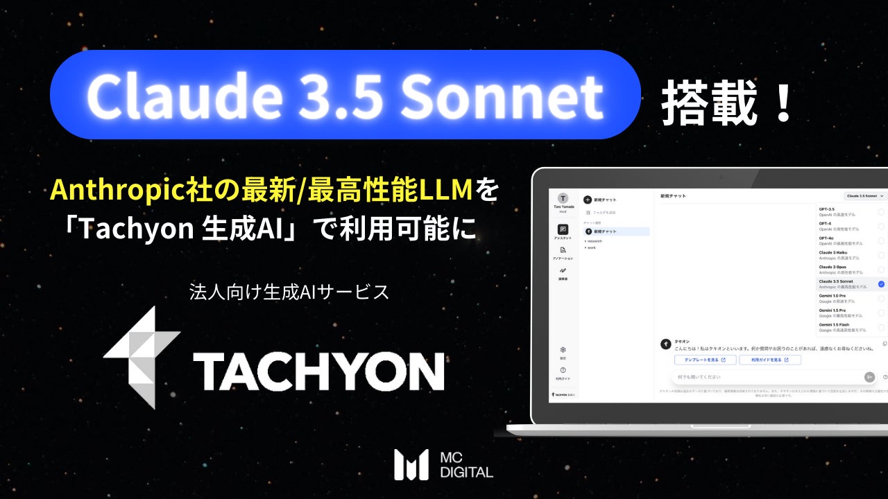 エムシーデジタル株式会社(本社:東京都千代田区、代表取締役社長:河内 伸学)は、同社が開発を進める法人向け生成AIサービス「Tachyon 生成AI」に、最新の大規模言語モデル(以下LLM:Large Language Models)である「Claude 3.5 Sonnet」を搭載しました。本アップデートにより、これまで以上に幅広い業務シーンで高精度なLLMをお使いいただくことが可能となります。