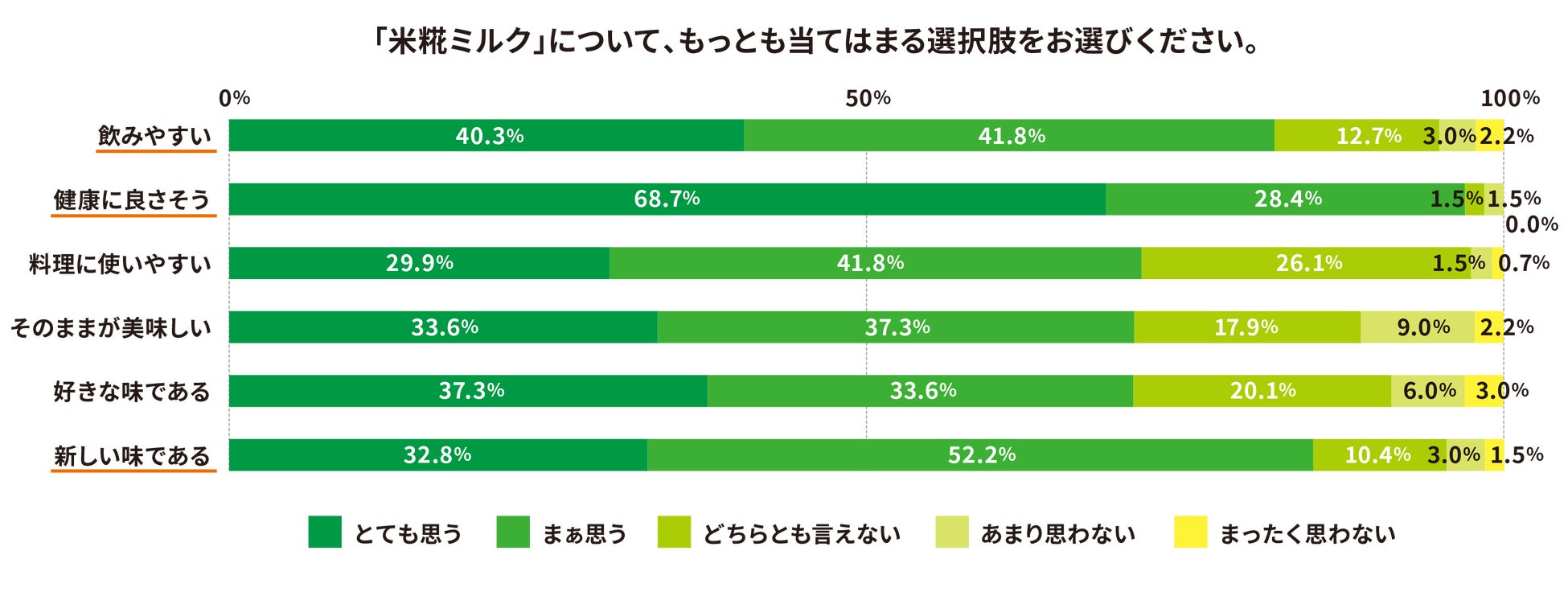 料理SNS「スナップディッシュ」を運営するスナップディッシュ株式会社(本社:東京都武蔵野市、代表取締役:舟田善)協力のもと、同アプリのユーザーを対象に発売前の「米糀ミルク」でテストモニターを実施しました。「とても思う」~「まったく思わない」の5段階評価のうち「とても思う」と「まぁ思う」を足した最多回答は「健康に良さそう」で97%、次いで「新しい味である」85%、「飲みやすい」82%という結果に。フリーアンサーではコーヒー、紅茶、スムージー、プロテインなど牛乳の代わりに使えてパンにも合うといったコメントが散見されました。また、飲むだけでなくスイーツや料理にも使いたいという声も多く見られました。継続して飲みたいシーンは約7割が朝食、約3割がおやつの時間と回答。「米糀ミルク」を「どの程度、家族や友人にすすめたいか」を尋ねた他者推奨意向(NPS®)の値は発売前にもかかわらず9となりました。
