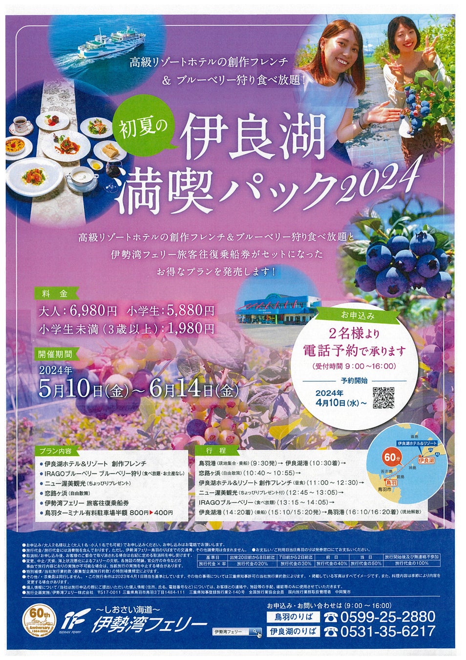 伊勢湾フェリー株式会社(三重県鳥羽市)では高級リゾートホテルの創作フレンチ&ブルーベリー狩り(食べ放題)&伊勢湾フェリー往復旅客運賃がセットになったお得な初夏の伊良湖満喫パックを鳥羽港発の旅客限定で販売をお知らせします