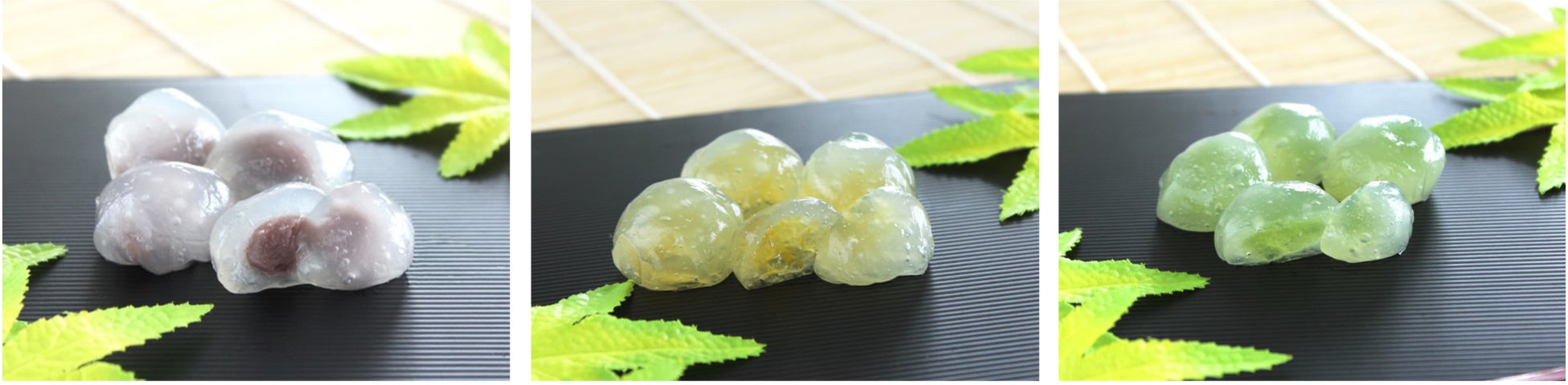 定番の「北海道こしあん」をはじめ、「瀬戸内甘夏みかん」「シャインマスカット」と夏らしいフレーバーをご用意しております。見た目も食感も楽しめる、夏のひんやりスイーツをぜひお召し上がりください。