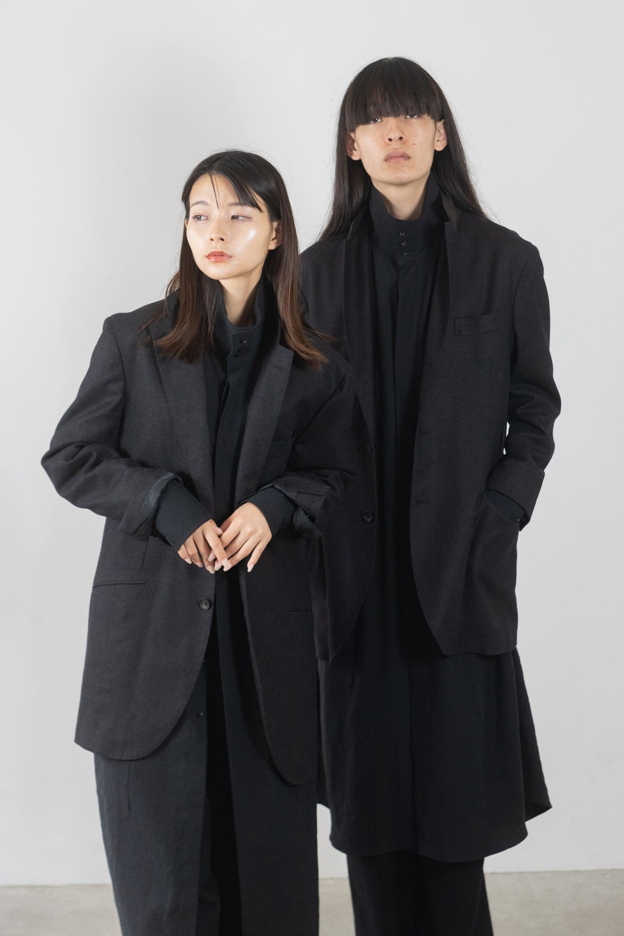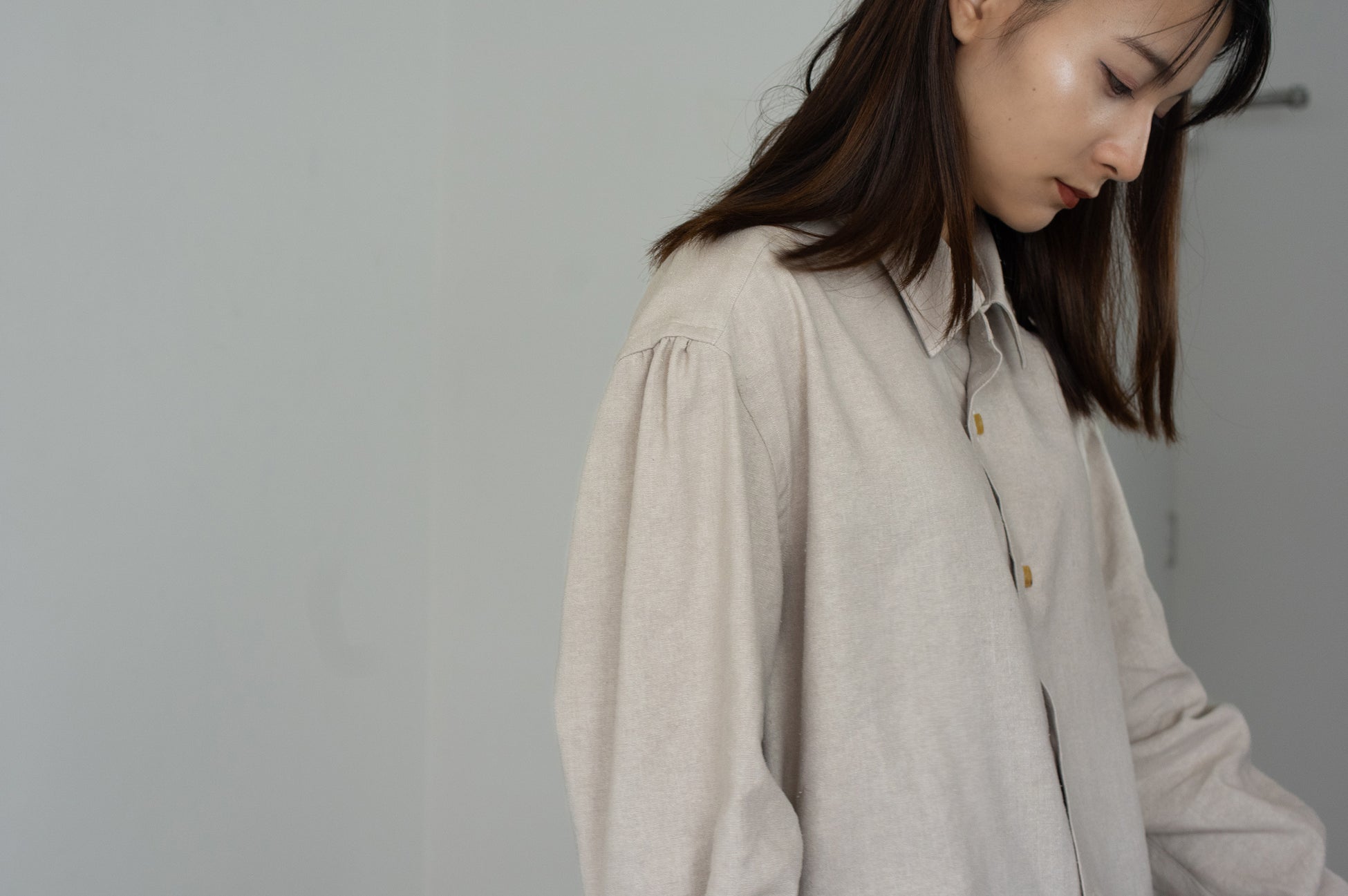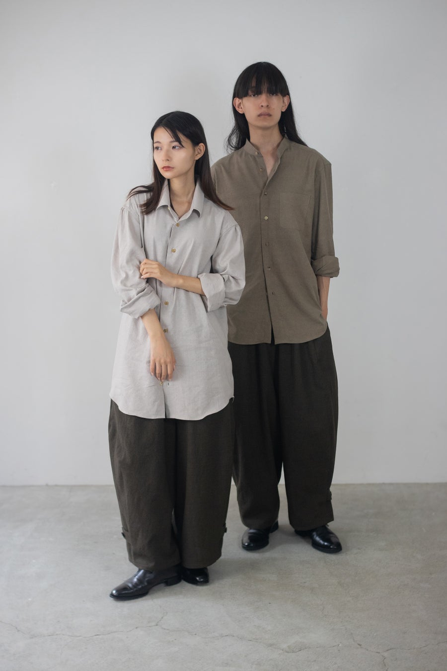 ブランドコンセプトとして、表情豊かな天然素材にこだわり、細部に至るまで職人技を活かしています。 生地には独特の風合いを持つ天然素材を採用し、縫製も細やかな運針で丁寧に仕上げています。 シルエットは着物にインスパイアされ、ミニマルなディテールや落ち着いた色合いが、日本の侘び寂びの美意識を体現しています。