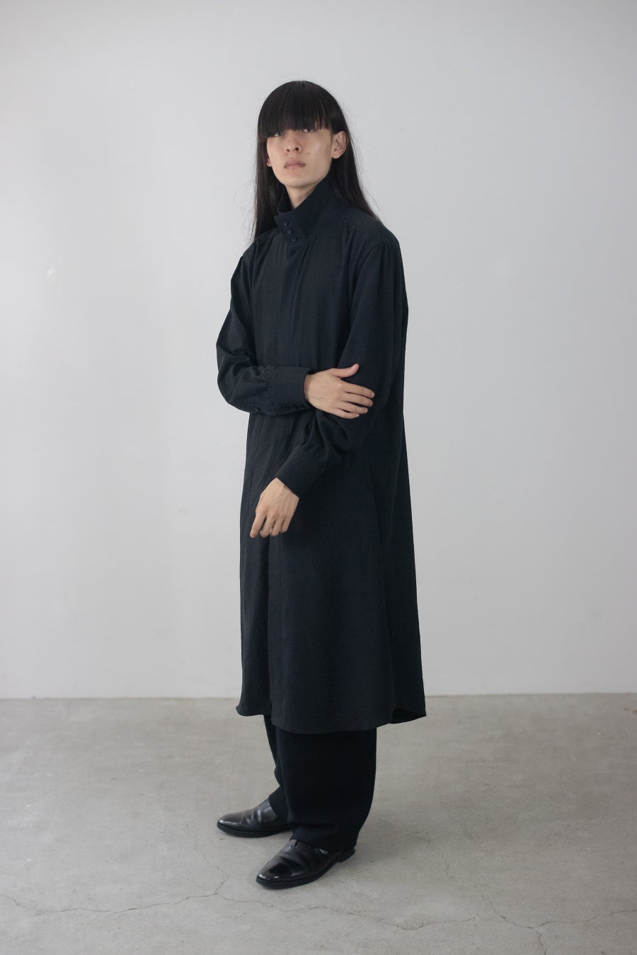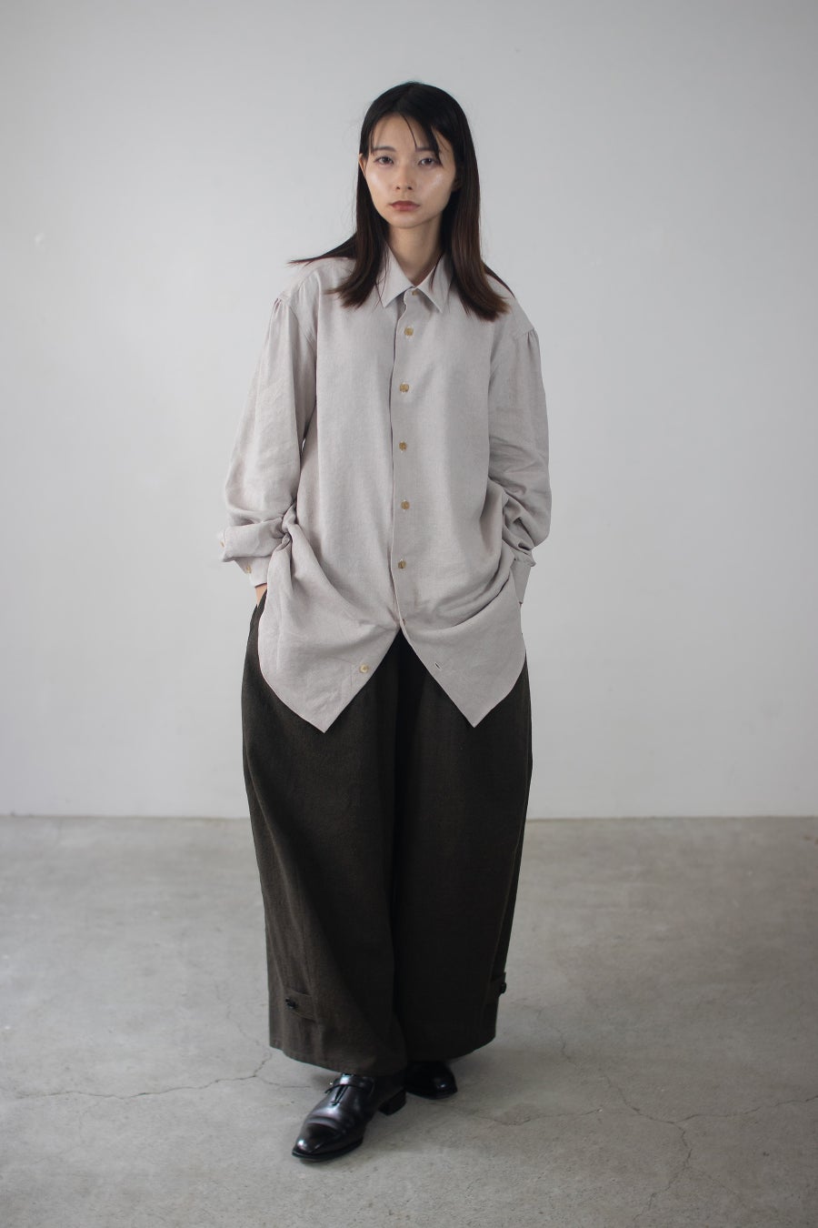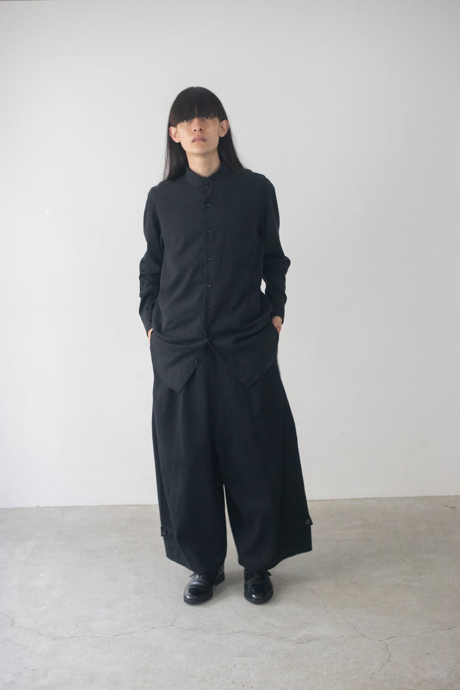 ブランドコンセプトとして、表情豊かな天然素材にこだわり、細部に至るまで職人技を活かしています。 生地には独特の風合いを持つ天然素材を採用し、縫製も細やかな運針で丁寧に仕上げています。 シルエットは着物にインスパイアされ、ミニマルなディテールや落ち着いた色合いが、日本の侘び寂びの美意識を体現しています。