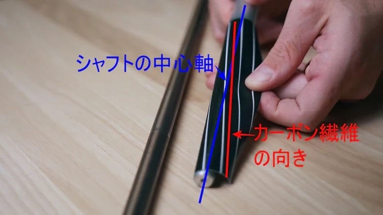 1つ目はシャフトの中心軸に対してカーボン繊維の向きがずれることです。ゴルフシャフトは手元が太く、先端が細く作られています。これに平面であるカーボンシートを巻こうとすると、中心軸に対して先端に巻いた部分が必ず斜めになります。シャフトの垂直向きとカーボン繊維の向きがずれてしまうことを「軸ずれ」といいます。ロール・ラッピング製法では通常で6度、最小でも3度の軸ずれを避けることができません。