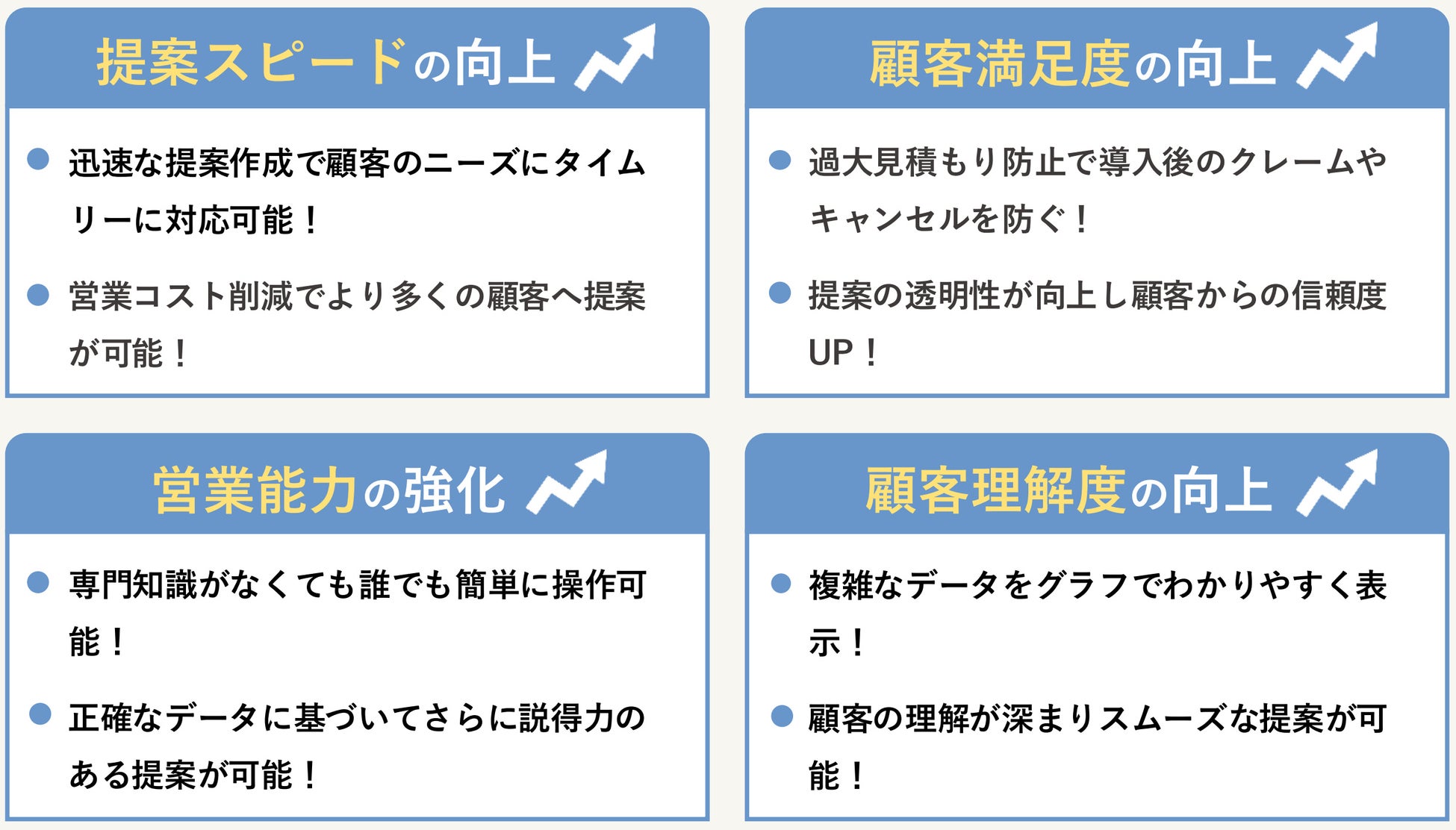・お客様にとってわかりやすく、安心して契約に進んでもらえるようになった・これまで曖昧だった部分が数値で明示されるようになり、クレームが大幅に減少した・営業活動の生産性が劇的に向上し、チームの士気も高まった・新人スタッフが即戦力になり、人材育成コストも削減できた